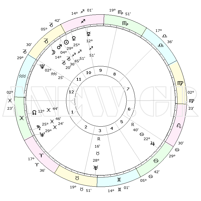 | | ΘΕΣΕΙΣ ΠΛΑΝΗΤΩΝ ΑΣΤΡΟΛΟΓΙΚΟΥ ΧΑΡΤΗ ΤΗΣ ΣΤΙΓΜΗΣ ΑΥΤΗΣ | | | | Πλανήτης | Ζώδιο | Μοίρες | Δεκαήμ. | Σε οίκο | Απόκλιση | | Ακμές των οίκων | | Ηλιος | Τοξότης | 29°41' | Τρίτο | 11 | 23 S 26 | | 1ος | 28°50' | Αιγόκερως | | Σελήνη | Αιγόκερως | 13°29' | Δεύτερο | 12 | 27 S 00 | | 2ος | 12°45' | Ιχθείς | | Ερμής | Τοξότης | 12°45' | Δεύτερο | 10 | 21 S 36 | | 3ος | 21°22' | Κριός | | Αφροδίτη | Τοξότης | 25°46' | Τρίτο | 11 | 23 S 27 | | 4ος | 20°02' | Ταύρος | | Αρης | Αιγόκερως | 04°33' | Πρώτο | 12 | 24 S 10 | | 5ος | 12°53' | Δίδυμοι | | Δίας | Καρκίνος | 22°41'R | Τρίτο | 6 | 21 N 44 | | 6ος | 04°16' | Καρκίνος | | Κρόνος | Ιχθείς | 25°45' | Τρίτο | 2 | 03 S 48 | | 7ος | 28°50' | Καρκίνος | | Ουρανός | Ταύρος | 28°16'R | Τρίτο | 4 | 19 N 34 | | 8ος | 12°45' | Παρθένος | | Ποσειδώνας | Ιχθείς | 29°24' | Τρίτο | 2 | 01 S 28 | | 9ος | 21°22' | Ζυγός | | Πλούτωνας | Υδροχόος | 02°25' | Πρώτο | 1 | 23 S 17 | | 10ος | 20°02' | Σκορπιός | | Β. Δεσμός | Ιχθείς | 12°44' | Δεύτερο | 1 | 06 S 47 | | 11ος | 12°53' | Τοξότης | | Ωροσκόπος | Αιγόκερως | 28°50' | Τρίτο | | | 12ος | 04°16' | Αιγόκερως | | Μεσουράνημα | Σκορπιός | 20°02' | Τρίτο | | | |