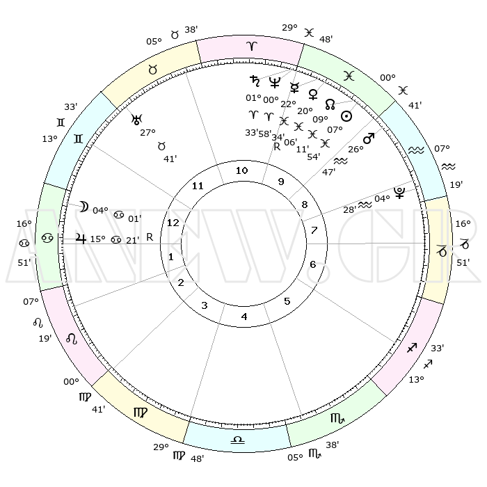 | | ΘΕΣΕΙΣ ΠΛΑΝΗΤΩΝ ΑΣΤΡΟΛΟΓΙΚΟΥ ΧΑΡΤΗ ΤΗΣ ΣΤΙΓΜΗΣ ΑΥΤΗΣ | | | | Πλανήτης | Ζώδιο | Μοίρες | Δεκαήμ. | Σε οίκο | Απόκλιση | | Ακμές των οίκων | | Ηλιος | Ιχθείς | 07°50' | Πρώτο | 10 | 08 S 38 | | 1ος | 26°58' | Δίδυμοι | | Σελήνη | Καρκίνος | 03°08' | Πρώτο | 1 | 28 N 13 | | 2ος | 17°58' | Καρκίνος | | Ερμής | Ιχθείς | 22°34'R | Τρίτο | 10 | 00 S 21 | | 3ος | 09°35' | Λέων | | Αφροδίτη | Ιχθείς | 20°02' | Τρίτο | 10 | 05 S 14 | | 4ος | 05°26' | Παρθένος | | Αρης | Υδροχόος | 26°44' | Τρίτο | 9 | 13 S 38 | | 5ος | 08°52' | Ζυγός | | Δίας | Καρκίνος | 15°21'R | Δεύτερο | 1 | 22 N 53 | | 6ος | 19°03' | Σκορπιός | | Κρόνος | Κριός | 01°32' | Πρώτο | 10 | 01 S 21 | | 7ος | 26°58' | Τοξότης | | Ουρανός | Ταύρος | 27°41' | Τρίτο | 12 | 19 N 28 | | 8ος | 17°58' | Αιγόκερως | | Ποσειδώνας | Κριός | 00°57' | Πρώτο | 10 | 00 S 49 | | 9ος | 09°35' | Υδροχόος | | Πλούτωνας | Υδροχόος | 04°28' | Πρώτο | 8 | 22 S 53 | | 10ος | 05°26' | Ιχθείς | | Β. Δεσμός | Ιχθείς | 09°11' | Πρώτο | 10 | 08 S 08 | | 11ος | 08°52' | Κριός | | Ωροσκόπος | Δίδυμοι | 26°58' | Τρίτο | | | 12ος | 19°03' | Ταύρος | | Μεσουράνημα | Ιχθείς | 05°26' | Πρώτο | | | |