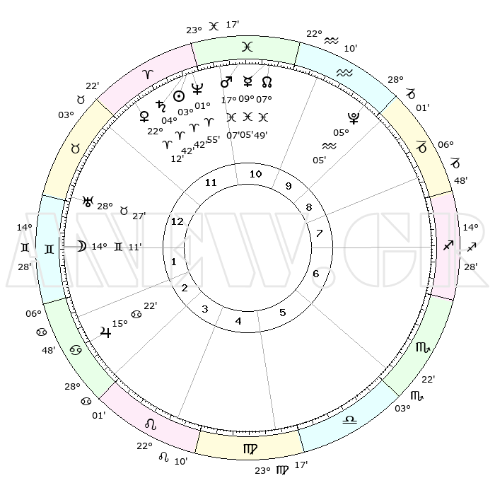 | | ΘΕΣΕΙΣ ΠΛΑΝΗΤΩΝ ΑΣΤΡΟΛΟΓΙΚΟΥ ΧΑΡΤΗ ΤΗΣ ΣΤΙΓΜΗΣ ΑΥΤΗΣ | | | | Πλανήτης | Ζώδιο | Μοίρες | Δεκαήμ. | Σε οίκο | Απόκλιση | | Ακμές των οίκων | | Ηλιος | Κριός | 03°38' | Πρώτο | 12 | 01 N 26 | | 1ος | 14°36' | Ταύρος | | Σελήνη | Δίδυμοι | 13°10' | Δεύτερο | 2 | 27 N 33 | | 2ος | 12°56' | Δίδυμοι | | Ερμής | Ιχθείς | 09°03' | Πρώτο | 11 | 08 S 01 | | 3ος | 05°12' | Καρκίνος | | Αφροδίτη | Κριός | 22°06' | Τρίτο | 12 | 07 N 55 | | 4ος | 27°09' | Καρκίνος | | Αρης | Ιχθείς | 17°04' | Δεύτερο | 11 | 06 S 05 | | 5ος | 23°15' | Λέων | | Δίας | Καρκίνος | 15°22' | Δεύτερο | 3 | 22 N 55 | | 6ος | 28°53' | Παρθένος | | Κρόνος | Κριός | 04°42' | Πρώτο | 12 | 00 S 05 | | 7ος | 14°36' | Σκορπιός | | Ουρανός | Ταύρος | 28°27' | Τρίτο | 1 | 19 N 38 | | 8ος | 12°56' | Τοξότης | | Ποσειδώνας | Κριός | 01°55' | Πρώτο | 12 | 00 S 26 | | 9ος | 05°12' | Αιγόκερως | | Πλούτωνας | Υδροχόος | 05°05' | Πρώτο | 10 | 22 S 48 | | 10ος | 27°09' | Αιγόκερως | | Β. Δεσμός | Ιχθείς | 07°49' | Πρώτο | 11 | 08 S 38 | | 11ος | 23°15' | Υδροχόος | | Ωροσκόπος | Ταύρος | 14°36' | Δεύτερο | | | 12ος | 28°53' | Ιχθείς | | Μεσουράνημα | Αιγόκερως | 27°09' | Τρίτο | | | |