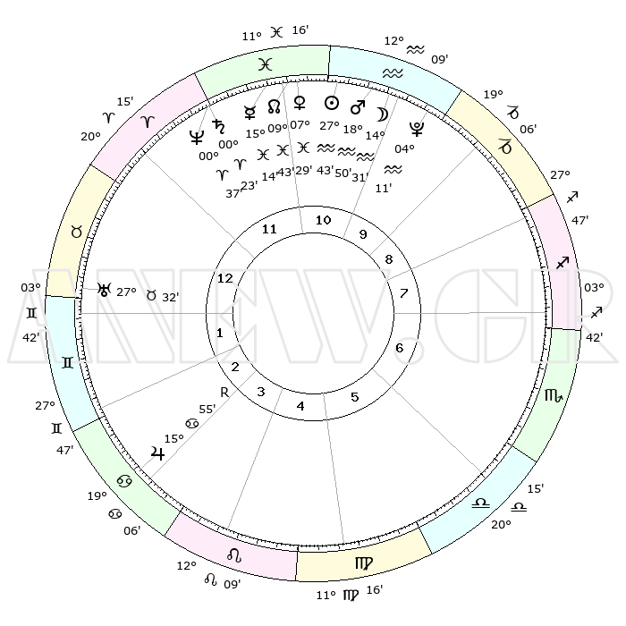 | | ΘΕΣΕΙΣ ΠΛΑΝΗΤΩΝ ΑΣΤΡΟΛΟΓΙΚΟΥ ΧΑΡΤΗ ΤΗΣ ΣΤΙΓΜΗΣ ΑΥΤΗΣ | | | | Πλανήτης | Ζώδιο | Μοίρες | Δεκαήμ. | Σε οίκο | Απόκλιση | | Ακμές των οίκων | | Ηλιος | Υδροχόος | 27°39' | Τρίτο | 11 | 12 S 17 | | 1ος | 02°46' | Ταύρος | | Σελήνη | Υδροχόος | 13°40' | Δεύτερο | 10 | 18 S 53 | | 2ος | 04°13' | Δίδυμοι | | Ερμής | Ιχθείς | 15°09' | Δεύτερο | 11 | 05 S 32 | | 3ος | 27°30' | Δίδυμοι | | Αφροδίτη | Ιχθείς | 07°24' | Πρώτο | 11 | 10 S 09 | | 4ος | 19°12' | Καρκίνος | | Αρης | Υδροχόος | 18°47' | Δεύτερο | 11 | 16 S 13 | | 5ος | 13°53' | Λέων | | Δίας | Καρκίνος | 15°55'R | Δεύτερο | 3 | 22 N 49 | | 6ος | 17°09' | Παρθένος | | Κρόνος | Κριός | 00°22' | Πρώτο | 12 | 01 S 49 | | 7ος | 02°46' | Σκορπιός | | Ουρανός | Ταύρος | 27°31' | Τρίτο | 1 | 19 N 25 | | 8ος | 04°13' | Τοξότης | | Ποσειδώνας | Κριός | 00°37' | Πρώτο | 12 | 00 S 58 | | 9ος | 27°30' | Τοξότης | | Πλούτωνας | Υδροχόος | 04°11' | Πρώτο | 10 | 22 S 56 | | 10ος | 19°12' | Αιγόκερως | | Β. Δεσμός | Ιχθείς | 09°43' | Πρώτο | 11 | 07 S 55 | | 11ος | 13°53' | Υδροχόος | | Ωροσκόπος | Ταύρος | 02°46' | Πρώτο | | | 12ος | 17°09' | Ιχθείς | | Μεσουράνημα | Αιγόκερως | 19°12' | Δεύτερο | | | |