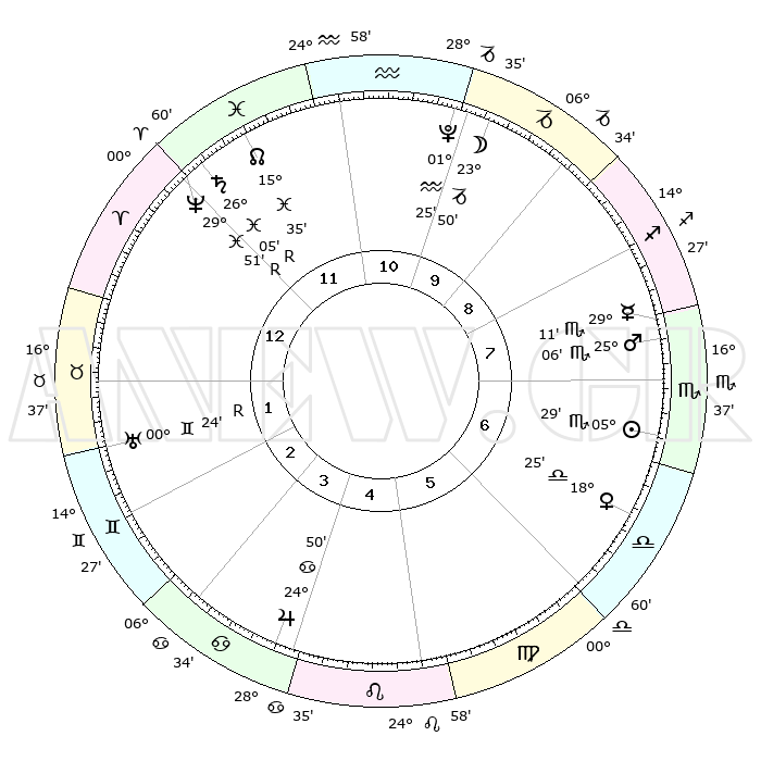 | | ΘΕΣΕΙΣ ΠΛΑΝΗΤΩΝ ΑΣΤΡΟΛΟΓΙΚΟΥ ΧΑΡΤΗ ΤΗΣ ΣΤΙΓΜΗΣ ΑΥΤΗΣ | | | | Πλανήτης | Ζώδιο | Μοίρες | Δεκαήμ. | Σε οίκο | Απόκλιση | | Ακμές των οίκων | | Ηλιος | Σκορπιός | 05°05' | Πρώτο | 12 | 13 S 13 | | 1ος | 22°13' | Σκορπιός | | Σελήνη | Αιγόκερως | 18°51' | Δεύτερο | 2 | 26 S 26 | | 2ος | 22°23' | Τοξότης | | Ερμής | Σκορπιός | 28°45' | Τρίτο | 1 | 22 S 37 | | 3ος | 26°52' | Αιγόκερως | | Αφροδίτη | Ζυγός | 17°54' | Δεύτερο | 11 | 05 S 38 | | 4ος | 02°36' | Ιχθείς | | Αρης | Σκορπιός | 24°49' | Τρίτο | 1 | 19 S 19 | | 5ος | 04°28' | Κριός | | Δίας | Καρκίνος | 24°49' | Τρίτο | 8 | 21 N 14 | | 6ος | 00°35' | Ταύρος | | Κρόνος | Ιχθείς | 26°06'R | Τρίτο | 4 | 03 S 49 | | 7ος | 22°13' | Ταύρος | | Ουρανός | Δίδυμοι | 00°25'R | Πρώτο | 7 | 20 N 02 | | 8ος | 22°23' | Δίδυμοι | | Ποσειδώνας | Ιχθείς | 29°52'R | Τρίτο | 4 | 01 S 19 | | 9ος | 26°52' | Καρκίνος | | Πλούτωνας | Υδροχόος | 01°25' | Πρώτο | 3 | 23 S 31 | | 10ος | 02°36' | Παρθένος | | Β. Δεσμός | Ιχθείς | 15°36' | Δεύτερο | 4 | 05 S 41 | | 11ος | 04°28' | Ζυγός | | Ωροσκόπος | Σκορπιός | 22°13' | Τρίτο | | | 12ος | 00°35' | Σκορπιός | | Μεσουράνημα | Παρθένος | 02°36' | Πρώτο | | | |