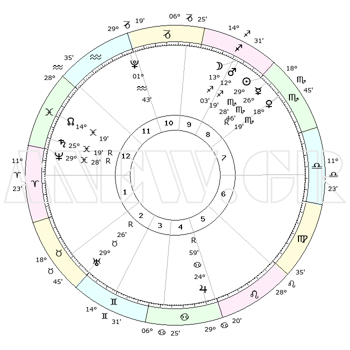 | | ΘΕΣΕΙΣ ΠΛΑΝΗΤΩΝ ΑΣΤΡΟΛΟΓΙΚΟΥ ΧΑΡΤΗ ΤΗΣ ΣΤΙΓΜΗΣ ΑΥΤΗΣ | | | | Πλανήτης | Ζώδιο | Μοίρες | Δεκαήμ. | Σε οίκο | Απόκλιση | | Ακμές των οίκων | | Ηλιος | Σκορπιός | 29°26' | Τρίτο | 8 | 20 S 01 | | 1ος | 19°20' | Ιχθείς | | Σελήνη | Τοξότης | 12°37' | Δεύτερο | 9 | 27 S 15 | | 2ος | 01°59' | Ταύρος | | Ερμής | Σκορπιός | 26°49'R | Τρίτο | 8 | 18 S 33 | | 3ος | 01°07' | Δίδυμοι | | Αφροδίτη | Σκορπιός | 18°16' | Δεύτερο | 8 | 16 S 17 | | 4ος | 23°59' | Δίδυμοι | | Αρης | Τοξότης | 12°18' | Δεύτερο | 9 | 22 S 50 | | 5ος | 15°55' | Καρκίνος | | Δίας | Καρκίνος | 24°59'R | Τρίτο | 5 | 21 N 16 | | 6ος | 11°46' | Λέων | | Κρόνος | Ιχθείς | 25°19'R | Τρίτο | 1 | 04 S 04 | | 7ος | 19°20' | Παρθένος | | Ουρανός | Ταύρος | 29°26'R | Τρίτο | 2 | 19 N 49 | | 8ος | 01°59' | Σκορπιός | | Ποσειδώνας | Ιχθείς | 29°28'R | Τρίτο | 1 | 01 S 27 | | 9ος | 01°07' | Τοξότης | | Πλούτωνας | Υδροχόος | 01°43' | Πρώτο | 11 | 23 S 27 | | 10ος | 23°59' | Τοξότης | | Β. Δεσμός | Ιχθείς | 14°19' | Δεύτερο | 12 | 06 S 10 | | 11ος | 15°55' | Αιγόκερως | | Ωροσκόπος | Ιχθείς | 19°20' | Δεύτερο | | | 12ος | 11°46' | Υδροχόος | | Μεσουράνημα | Τοξότης | 23°59' | Τρίτο | | | |