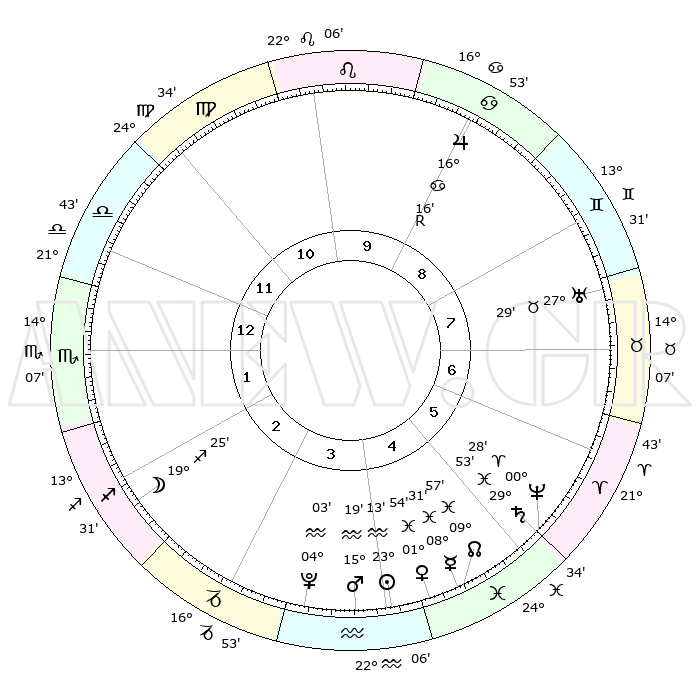 | | ΘΕΣΕΙΣ ΠΛΑΝΗΤΩΝ ΑΣΤΡΟΛΟΓΙΚΟΥ ΧΑΡΤΗ ΤΗΣ ΣΤΙΓΜΗΣ ΑΥΤΗΣ | | | | Πλανήτης | Ζώδιο | Μοίρες | Δεκαήμ. | Σε οίκο | Απόκλιση | | Ακμές των οίκων | | Ηλιος | Υδροχόος | 23°09' | Τρίτο | 4 | 13 S 48 | | 1ος | 22°56' | Ζυγός | | Σελήνη | Τοξότης | 18°33' | Δεύτερο | 2 | 28 S 06 | | 2ος | 20°56' | Σκορπιός | | Ερμής | Ιχθείς | 08°24' | Πρώτο | 5 | 08 S 57 | | 3ος | 22°23' | Τοξότης | | Αφροδίτη | Ιχθείς | 01°49' | Πρώτο | 5 | 12 S 12 | | 4ος | 26°08' | Αιγόκερως | | Αρης | Υδροχόος | 15°16' | Δεύτερο | 4 | 17 S 17 | | 5ος | 29°05' | Υδροχόος | | Δίας | Καρκίνος | 16°17'R | Δεύτερο | 9 | 22 N 46 | | 6ος | 28°20' | Ιχθείς | | Κρόνος | Ιχθείς | 29°53' | Τρίτο | 6 | 02 S 01 | | 7ος | 22°56' | Κριός | | Ουρανός | Ταύρος | 27°29' | Τρίτο | 8 | 19 N 25 | | 8ος | 20°56' | Ταύρος | | Ποσειδώνας | Κριός | 00°28' | Πρώτο | 6 | 01 S 01 | | 9ος | 22°23' | Δίδυμοι | | Πλούτωνας | Υδροχόος | 04°02' | Πρώτο | 4 | 22 S 58 | | 10ος | 26°08' | Καρκίνος | | Β. Δεσμός | Ιχθείς | 09°57' | Πρώτο | 5 | 07 S 50 | | 11ος | 29°05' | Λέων | | Ωροσκόπος | Ζυγός | 22°56' | Τρίτο | | | 12ος | 28°20' | Παρθένος | | Μεσουράνημα | Καρκίνος | 26°08' | Τρίτο | | | |