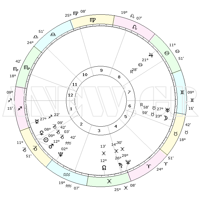 | | ΘΕΣΕΙΣ ΠΛΑΝΗΤΩΝ ΑΣΤΡΟΛΟΓΙΚΟΥ ΧΑΡΤΗ ΤΗΣ ΣΤΙΓΜΗΣ ΑΥΤΗΣ | | | | Πλανήτης | Ζώδιο | Μοίρες | Δεκαήμ. | Σε οίκο | Απόκλιση | | Ακμές των οίκων | | Ηλιος | Αιγόκερως | 09°37' | Πρώτο | 2 | 23 S 05 | | 1ος | 14°54' | Σκορπιός | | Σελήνη | Ταύρος | 22°45' | Τρίτο | 7 | 23 N 06 | | 2ος | 14°22' | Τοξότης | | Ερμής | Τοξότης | 27°14' | Τρίτο | 2 | 23 S 52 | | 3ος | 17°50' | Αιγόκερως | | Αφροδίτη | Αιγόκερως | 08°02' | Πρώτο | 2 | 23 S 39 | | 4ος | 23°07' | Υδροχόος | | Αρης | Αιγόκερως | 11°59' | Δεύτερο | 2 | 23 S 46 | | 5ος | 25°32' | Ιχθείς | | Δίας | Καρκίνος | 21°28'R | Τρίτο | 9 | 21 N 57 | | 6ος | 22°35' | Κριός | | Κρόνος | Ιχθείς | 26°14' | Τρίτο | 5 | 03 S 34 | | 7ος | 14°54' | Ταύρος | | Ουρανός | Ταύρος | 27°58'R | Τρίτο | 7 | 19 N 31 | | 8ος | 14°22' | Δίδυμοι | | Ποσειδώνας | Ιχθείς | 29°30' | Τρίτο | 5 | 01 S 25 | | 9ος | 17°50' | Καρκίνος | | Πλούτωνας | Υδροχόος | 02°42' | Πρώτο | 3 | 23 S 14 | | 10ος | 23°07' | Λέων | | Β. Δεσμός | Ιχθείς | 12°13' | Δεύτερο | 4 | 06 S 59 | | 11ος | 25°32' | Παρθένος | | Ωροσκόπος | Σκορπιός | 14°54' | Δεύτερο | | | 12ος | 22°35' | Ζυγός | | Μεσουράνημα | Λέων | 23°07' | Τρίτο | | | |