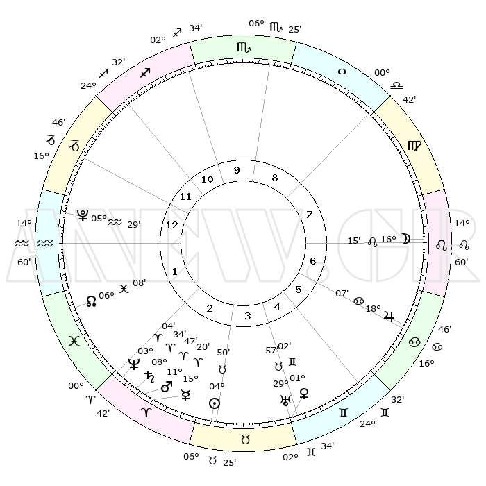 | | ΘΕΣΕΙΣ ΠΛΑΝΗΤΩΝ ΑΣΤΡΟΛΟΓΙΚΟΥ ΧΑΡΤΗ ΤΗΣ ΣΤΙΓΜΗΣ ΑΥΤΗΣ | | | | Πλανήτης | Ζώδιο | Μοίρες | Δεκαήμ. | Σε οίκο | Απόκλιση | | Ακμές των οίκων | | Ηλιος | Ταύρος | 04°46' | Πρώτο | 3 | 13 N 06 | | 1ος | 19°59' | Αιγόκερως | | Σελήνη | Λέων | 15°28' | Δεύτερο | 7 | 18 N 01 | | 2ος | 02°07' | Ιχθείς | | Ερμής | Κριός | 15°14' | Δεύτερο | 3 | 03 N 45 | | 3ος | 11°51' | Κριός | | Αφροδίτη | Δίδυμοι | 00°58' | Πρώτο | 4 | 20 N 58 | | 4ος | 12°08' | Ταύρος | | Αρης | Κριός | 11°44' | Δεύτερο | 2 | 03 N 47 | | 5ος | 05°47' | Δίδυμοι | | Δίας | Καρκίνος | 18°07' | Δεύτερο | 6 | 22 N 35 | | 6ος | 26°59' | Δίδυμοι | | Κρόνος | Κριός | 08°34' | Πρώτο | 2 | 01 N 25 | | 7ος | 19°59' | Καρκίνος | | Ουρανός | Ταύρος | 29°57' | Τρίτο | 4 | 19 N 58 | | 8ος | 02°07' | Παρθένος | | Ποσειδώνας | Κριός | 03°04' | Πρώτο | 2 | 00 N 01 | | 9ος | 11°51' | Ζυγός | | Πλούτωνας | Υδροχόος | 05°29' | Πρώτο | 1 | 22 S 48 | | 10ος | 12°08' | Σκορπιός | | Β. Δεσμός | Ιχθείς | 06°08' | Πρώτο | 2 | 09 S 16 | | 11ος | 05°47' | Τοξότης | | Ωροσκόπος | Αιγόκερως | 19°59' | Δεύτερο | | | 12ος | 26°59' | Τοξότης | | Μεσουράνημα | Σκορπιός | 12°08' | Δεύτερο | | | |