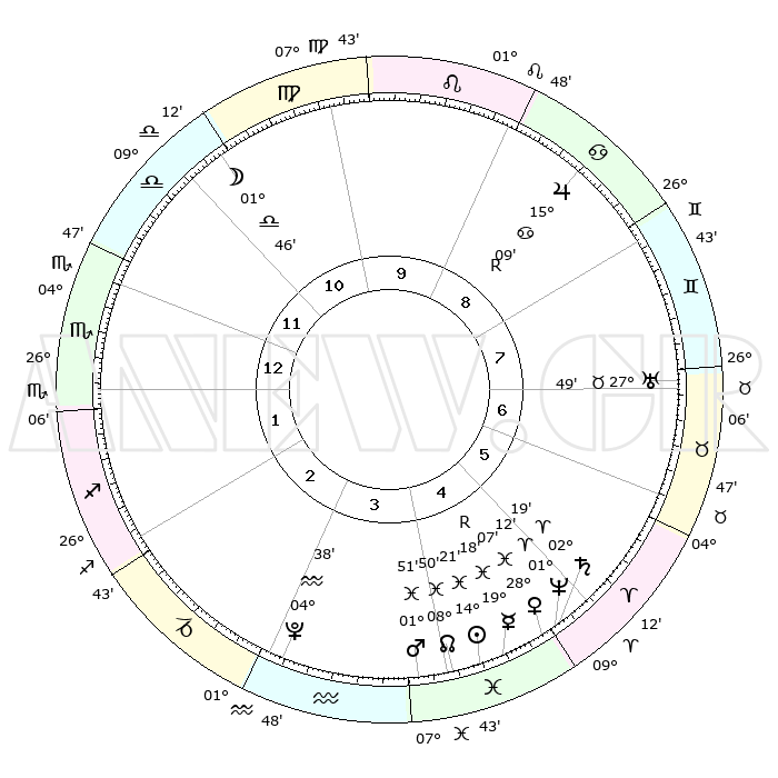 | | ΘΕΣΕΙΣ ΠΛΑΝΗΤΩΝ ΑΣΤΡΟΛΟΓΙΚΟΥ ΧΑΡΤΗ ΤΗΣ ΣΤΙΓΜΗΣ ΑΥΤΗΣ | | | | Πλανήτης | Ζώδιο | Μοίρες | Δεκαήμ. | Σε οίκο | Απόκλιση | | Ακμές των οίκων | | Ηλιος | Ιχθείς | 14°18' | Δεύτερο | 4 | 06 S 11 | | 1ος | 12°01' | Σκορπιός | | Σελήνη | Ζυγός | 01°08' | Πρώτο | 11 | 02 S 17 | | 2ος | 11°15' | Τοξότης | | Ερμής | Ιχθείς | 19°21'R | Δεύτερο | 4 | 00 S 50 | | 3ος | 14°22' | Αιγόκερως | | Αφροδίτη | Ιχθείς | 28°03' | Τρίτο | 5 | 01 S 58 | | 4ος | 19°26' | Υδροχόος | | Αρης | Ιχθείς | 01°48' | Πρώτο | 4 | 11 S 51 | | 5ος | 22°00' | Ιχθείς | | Δίας | Καρκίνος | 15°09'R | Δεύτερο | 9 | 22 N 55 | | 6ος | 19°25' | Κριός | | Κρόνος | Κριός | 02°18' | Πρώτο | 5 | 01 S 02 | | 7ος | 12°01' | Ταύρος | | Ουρανός | Ταύρος | 27°49' | Τρίτο | 7 | 19 N 30 | | 8ος | 11°15' | Δίδυμοι | | Ποσειδώνας | Κριός | 01°11' | Πρώτο | 5 | 00 S 44 | | 9ος | 14°22' | Καρκίνος | | Πλούτωνας | Υδροχόος | 04°38' | Πρώτο | 3 | 22 S 52 | | 10ος | 19°26' | Λέων | | Β. Δεσμός | Ιχθείς | 08°50' | Πρώτο | 4 | 08 S 15 | | 11ος | 22°00' | Παρθένος | | Ωροσκόπος | Σκορπιός | 12°01' | Δεύτερο | | | 12ος | 19°25' | Ζυγός | | Μεσουράνημα | Λέων | 19°26' | Δεύτερο | | | |