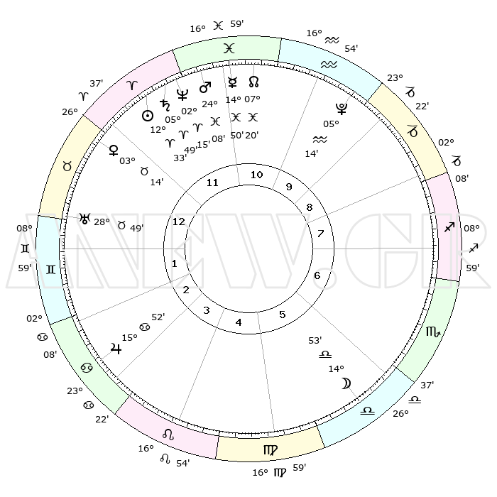 | | ΘΕΣΕΙΣ ΠΛΑΝΗΤΩΝ ΑΣΤΡΟΛΟΓΙΚΟΥ ΧΑΡΤΗ ΤΗΣ ΣΤΙΓΜΗΣ ΑΥΤΗΣ | | | | Πλανήτης | Ζώδιο | Μοίρες | Δεκαήμ. | Σε οίκο | Απόκλιση | | Ακμές των οίκων | | Ηλιος | Κριός | 12°29' | Δεύτερο | 12 | 04 N 56 | | 1ος | 07°27' | Ταύρος | | Σελήνη | Ζυγός | 13°60' | Δεύτερο | 6 | 08 S 17 | | 2ος | 07°38' | Δίδυμοι | | Ερμής | Ιχθείς | 14°46' | Δεύτερο | 11 | 07 S 22 | | 3ος | 00°29' | Καρκίνος | | Αφροδίτη | Ταύρος | 03°09' | Πρώτο | 12 | 12 N 12 | | 4ος | 22°15' | Καρκίνος | | Αρης | Ιχθείς | 24°05' | Τρίτο | 12 | 03 S 18 | | 5ος | 17°27' | Λέων | | Δίας | Καρκίνος | 15°52' | Δεύτερο | 3 | 22 N 52 | | 6ος | 21°39' | Παρθένος | | Κρόνος | Κριός | 05°49' | Πρώτο | 12 | 00 N 21 | | 7ος | 07°27' | Σκορπιός | | Ουρανός | Ταύρος | 28°49' | Τρίτο | 1 | 19 N 43 | | 8ος | 07°38' | Τοξότης | | Ποσειδώνας | Κριός | 02°15' | Πρώτο | 12 | 00 S 18 | | 9ος | 00°29' | Αιγόκερως | | Πλούτωνας | Υδροχόος | 05°14' | Πρώτο | 10 | 22 S 47 | | 10ος | 22°15' | Αιγόκερως | | Β. Δεσμός | Ιχθείς | 07°20' | Πρώτο | 11 | 08 S 49 | | 11ος | 17°27' | Υδροχόος | | Ωροσκόπος | Ταύρος | 07°27' | Πρώτο | | | 12ος | 21°39' | Ιχθείς | | Μεσουράνημα | Αιγόκερως | 22°15' | Τρίτο | | | |