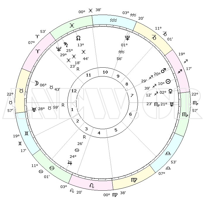 | | ΘΕΣΕΙΣ ΠΛΑΝΗΤΩΝ ΑΣΤΡΟΛΟΓΙΚΟΥ ΧΑΡΤΗ ΤΗΣ ΣΤΙΓΜΗΣ ΑΥΤΗΣ | | | | Πλανήτης | Ζώδιο | Μοίρες | Δεκαήμ. | Σε οίκο | Απόκλιση | | Ακμές των οίκων | | Ηλιος | Τοξότης | 10°37' | Δεύτερο | 8 | 22 S 02 | | 1ος | 06°06' | Ταύρος | | Σελήνη | Ταύρος | 06°12' | Πρώτο | 1 | 17 N 19 | | 2ος | 06°39' | Δίδυμοι | | Ερμής | Σκορπιός | 21°22' | Τρίτο | 7 | 15 S 34 | | 3ος | 29°37' | Δίδυμοι | | Αφροδίτη | Τοξότης | 02°09' | Πρώτο | 7 | 19 S 57 | | 4ος | 21°22' | Καρκίνος | | Αρης | Τοξότης | 20°27' | Τρίτο | 8 | 23 S 46 | | 5ος | 16°25' | Λέων | | Δίας | Καρκίνος | 24°26'R | Τρίτο | 4 | 21 N 23 | | 6ος | 20°21' | Παρθένος | | Κρόνος | Ιχθείς | 25°18' | Τρίτο | 12 | 04 S 02 | | 7ος | 06°06' | Σκορπιός | | Ουρανός | Ταύρος | 28°59'R | Τρίτο | 1 | 19 N 44 | | 8ος | 06°39' | Τοξότης | | Ποσειδώνας | Ιχθείς | 29°23'R | Τρίτο | 12 | 01 S 29 | | 9ος | 29°37' | Τοξότης | | Πλούτωνας | Υδροχόος | 01°56' | Πρώτο | 10 | 23 S 24 | | 10ος | 21°22' | Αιγόκερως | | Β. Δεσμός | Ιχθείς | 13°44' | Δεύτερο | 11 | 06 S 24 | | 11ος | 16°25' | Υδροχόος | | Ωροσκόπος | Ταύρος | 06°06' | Πρώτο | | | 12ος | 20°21' | Ιχθείς | | Μεσουράνημα | Αιγόκερως | 21°22' | Τρίτο | | | |