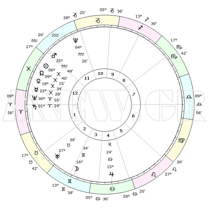 | | ΘΕΣΕΙΣ ΠΛΑΝΗΤΩΝ ΑΣΤΡΟΛΟΓΙΚΟΥ ΧΑΡΤΗ ΤΗΣ ΣΤΙΓΜΗΣ ΑΥΤΗΣ | | | | Πλανήτης | Ζώδιο | Μοίρες | Δεκαήμ. | Σε οίκο | Απόκλιση | | Ακμές των οίκων | | Ηλιος | Ιχθείς | 06°37' | Πρώτο | 12 | 09 S 05 | | 1ος | 09°08' | Ιχθείς | | Σελήνη | Δίδυμοι | 15°49' | Δεύτερο | 3 | 27 N 53 | | 2ος | 23°33' | Κριός | | Ερμής | Ιχθείς | 22°28' | Τρίτο | 1 | 00 S 39 | | 3ος | 24°30' | Ταύρος | | Αφροδίτη | Ιχθείς | 18°30' | Δεύτερο | 1 | 05 S 50 | | 4ος | 18°05' | Δίδυμοι | | Αρης | Υδροχόος | 25°46' | Τρίτο | 12 | 13 S 57 | | 5ος | 09°48' | Καρκίνος | | Δίας | Καρκίνος | 15°24'R | Δεύτερο | 5 | 22 N 53 | | 6ος | 04°22' | Λέων | | Κρόνος | Κριός | 01°23' | Πρώτο | 1 | 01 S 24 | | 7ος | 09°08' | Παρθένος | | Ουρανός | Ταύρος | 27°39' | Τρίτο | 3 | 19 N 27 | | 8ος | 23°33' | Ζυγός | | Ποσειδώνας | Κριός | 00°55' | Πρώτο | 1 | 00 S 50 | | 9ος | 24°30' | Σκορπιός | | Πλούτωνας | Υδροχόος | 04°26' | Πρώτο | 12 | 22 S 53 | | 10ος | 18°05' | Τοξότης | | Β. Δεσμός | Ιχθείς | 09°15' | Πρώτο | 1 | 08 S 06 | | 11ος | 09°48' | Αιγόκερως | | Ωροσκόπος | Ιχθείς | 09°08' | Πρώτο | | | 12ος | 04°22' | Υδροχόος | | Μεσουράνημα | Τοξότης | 18°05' | Δεύτερο | | | |