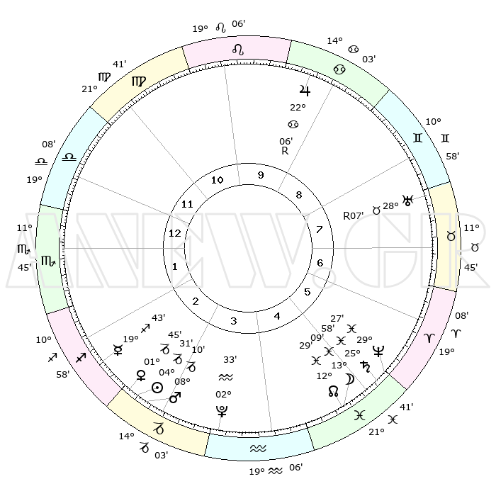 | | ΘΕΣΕΙΣ ΠΛΑΝΗΤΩΝ ΑΣΤΡΟΛΟΓΙΚΟΥ ΧΑΡΤΗ ΤΗΣ ΣΤΙΓΜΗΣ ΑΥΤΗΣ | | | | Πλανήτης | Ζώδιο | Μοίρες | Δεκαήμ. | Σε οίκο | Απόκλιση | | Ακμές των οίκων | | Ηλιος | Αιγόκερως | 04°26' | Πρώτο | 3 | 23 S 21 | | 1ος | 18°43' | Ζυγός | | Σελήνη | Ιχθείς | 12°07' | Δεύτερο | 5 | 06 S 57 | | 2ος | 16°28' | Σκορπιός | | Ερμής | Τοξότης | 19°36' | Δεύτερο | 3 | 22 S 53 | | 3ος | 17°42' | Τοξότης | | Αφροδίτη | Αιγόκερως | 01°39' | Πρώτο | 3 | 23 S 42 | | 4ος | 21°14' | Αιγόκερως | | Αρης | Αιγόκερως | 08°06' | Πρώτο | 3 | 24 S 02 | | 5ος | 24°10' | Υδροχόος | | Δίας | Καρκίνος | 22°07'R | Τρίτο | 10 | 21 N 50 | | 6ος | 23°43' | Ιχθείς | | Κρόνος | Ιχθείς | 25°58' | Τρίτο | 6 | 03 S 42 | | 7ος | 18°43' | Κριός | | Ουρανός | Ταύρος | 28°07'R | Τρίτο | 8 | 19 N 33 | | 8ος | 16°29' | Ταύρος | | Ποσειδώνας | Ιχθείς | 29°27' | Τρίτο | 6 | 01 S 27 | | 9ος | 17°42' | Δίδυμοι | | Πλούτωνας | Υδροχόος | 02°33' | Πρώτο | 4 | 23 S 15 | | 10ος | 21°13' | Καρκίνος | | Β. Δεσμός | Ιχθείς | 12°29' | Δεύτερο | 5 | 06 S 52 | | 11ος | 24°10' | Λέων | | Ωροσκόπος | Ζυγός | 18°43' | Δεύτερο | | | 12ος | 23°43' | Παρθένος | | Μεσουράνημα | Καρκίνος | 21°13' | Τρίτο | | | |