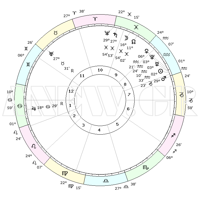 | | ΘΕΣΕΙΣ ΠΛΑΝΗΤΩΝ ΑΣΤΡΟΛΟΓΙΚΟΥ ΧΑΡΤΗ ΤΗΣ ΣΤΙΓΜΗΣ ΑΥΤΗΣ | | | | Πλανήτης | Ζώδιο | Μοίρες | Δεκαήμ. | Σε οίκο | Απόκλιση | | Ακμές των οίκων | | Ηλιος | Υδροχόος | 02°28' | Πρώτο | 9 | 19 S 36 | | 1ος | 13°59' | Δίδυμοι | | Σελήνη | Ιχθείς | 15°51' | Δεύτερο | 10 | 05 S 02 | | 2ος | 06°23' | Καρκίνος | | Ερμής | Υδροχόος | 03°02' | Πρώτο | 9 | 21 S 29 | | 3ος | 27°36' | Καρκίνος | | Αφροδίτη | Υδροχόος | 06°15' | Πρώτο | 9 | 19 S 51 | | 4ος | 21°41' | Λέων | | Αρης | Αιγόκερως | 29°19' | Τρίτο | 9 | 21 S 16 | | 5ος | 22°43' | Παρθένος | | Δίας | Καρκίνος | 18°30'R | Δεύτερο | 2 | 22 N 26 | | 6ος | 02°47' | Σκορπιός | | Κρόνος | Ιχθείς | 27°52' | Τρίτο | 11 | 02 S 52 | | 7ος | 13°59' | Τοξότης | | Ουρανός | Ταύρος | 27°31'R | Τρίτο | 12 | 19 N 25 | | 8ος | 06°23' | Αιγόκερως | | Ποσειδώνας | Ιχθείς | 29°54' | Τρίτο | 11 | 01 S 15 | | 9ος | 27°36' | Αιγόκερως | | Πλούτωνας | Υδροχόος | 03°24' | Πρώτο | 9 | 23 S 05 | | 10ος | 21°41' | Υδροχόος | | Β. Δεσμός | Ιχθείς | 11°02' | Δεύτερο | 10 | 07 S 26 | | 11ος | 22°43' | Ιχθείς | | Ωροσκόπος | Δίδυμοι | 13°59' | Δεύτερο | | | 12ος | 02°46' | Ταύρος | | Μεσουράνημα | Υδροχόος | 21°41' | Τρίτο | | | |