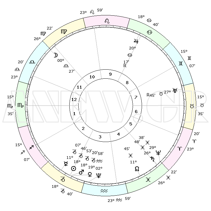 | | ΘΕΣΕΙΣ ΠΛΑΝΗΤΩΝ ΑΣΤΡΟΛΟΓΙΚΟΥ ΧΑΡΤΗ ΤΗΣ ΣΤΙΓΜΗΣ ΑΥΤΗΣ | | | | Πλανήτης | Ζώδιο | Μοίρες | Δεκαήμ. | Σε οίκο | Απόκλιση | | Ακμές των οίκων | | Ηλιος | Αιγόκερως | 17°41' | Δεύτερο | 3 | 22 S 16 | | 1ος | 29°05' | Ζυγός | | Σελήνη | Παρθένος | 16°59' | Δεύτερο | 11 | 04 N 35 | | 2ος | 27°26' | Σκορπιός | | Ερμής | Αιγόκερως | 09°28' | Πρώτο | 3 | 24 S 22 | | 3ος | 29°19' | Τοξότης | | Αφροδίτη | Αιγόκερως | 18°00' | Δεύτερο | 3 | 22 S 58 | | 4ος | 03°27' | Υδροχόος | | Αρης | Αιγόκερως | 18°04' | Δεύτερο | 3 | 23 S 08 | | 5ος | 06°23' | Ιχθείς | | Δίας | Καρκίνος | 20°25'R | Τρίτο | 9 | 22 N 08 | | 6ος | 05°08' | Κριός | | Κρόνος | Ιχθείς | 26°44' | Τρίτο | 5 | 03 S 21 | | 7ος | 29°05' | Κριός | | Ουρανός | Ταύρος | 27°46'R | Τρίτο | 8 | 19 N 28 | | 8ος | 27°26' | Ταύρος | | Ποσειδώνας | Ιχθείς | 29°37' | Τρίτο | 5 | 01 S 22 | | 9ος | 29°19' | Δίδυμοι | | Πλούτωνας | Υδροχόος | 02°56' | Πρώτο | 3 | 23 S 10 | | 10ος | 03°27' | Λέων | | Β. Δεσμός | Ιχθείς | 11°48' | Δεύτερο | 5 | 07 S 08 | | 11ος | 06°23' | Παρθένος | | Ωροσκόπος | Ζυγός | 29°05' | Τρίτο | | | 12ος | 05°08' | Ζυγός | | Μεσουράνημα | Λέων | 03°27' | Πρώτο | | | |