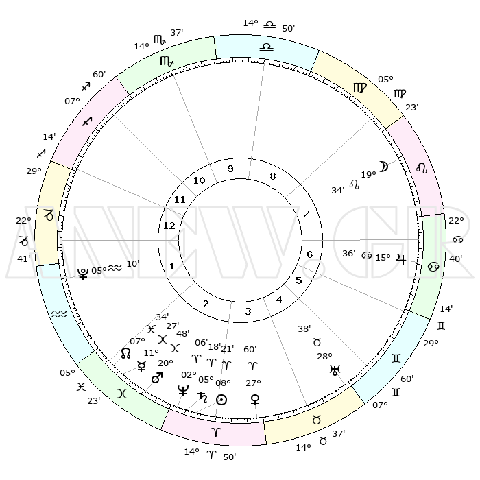 | | ΘΕΣΕΙΣ ΠΛΑΝΗΤΩΝ ΑΣΤΡΟΛΟΓΙΚΟΥ ΧΑΡΤΗ ΤΗΣ ΣΤΙΓΜΗΣ ΑΥΤΗΣ | | | | Πλανήτης | Ζώδιο | Μοίρες | Δεκαήμ. | Σε οίκο | Απόκλιση | | Ακμές των οίκων | | Ηλιος | Κριός | 08°17' | Πρώτο | 3 | 03 N 17 | | 1ος | 29°38' | Τοξότης | | Σελήνη | Λέων | 18°43' | Δεύτερο | 8 | 16 N 55 | | 2ος | 06°42' | Υδροχόος | | Ερμής | Ιχθείς | 11°24' | Δεύτερο | 2 | 08 S 01 | | 3ος | 16°40' | Ιχθείς | | Αφροδίτη | Κριός | 27°55' | Τρίτο | 4 | 10 N 12 | | 4ος | 20°40' | Κριός | | Αρης | Ιχθείς | 20°45' | Τρίτο | 3 | 04 S 38 | | 5ος | 17°03' | Ταύρος | | Δίας | Καρκίνος | 15°36' | Δεύτερο | 7 | 22 N 53 | | 6ος | 08°52' | Δίδυμοι | | Κρόνος | Κριός | 05°17' | Πρώτο | 3 | 00 N 09 | | 7ος | 29°38' | Δίδυμοι | | Ουρανός | Ταύρος | 28°38' | Τρίτο | 5 | 19 N 41 | | 8ος | 06°42' | Λέων | | Ποσειδώνας | Κριός | 02°06' | Πρώτο | 3 | 00 S 22 | | 9ος | 16°40' | Παρθένος | | Πλούτωνας | Υδροχόος | 05°10' | Πρώτο | 1 | 22 S 48 | | 10ος | 20°40' | Ζυγός | | Β. Δεσμός | Ιχθείς | 07°34' | Πρώτο | 2 | 08 S 44 | | 11ος | 17°03' | Σκορπιός | | Ωροσκόπος | Τοξότης | 29°38' | Τρίτο | | | 12ος | 08°52' | Τοξότης | | Μεσουράνημα | Ζυγός | 20°40' | Τρίτο | | | |