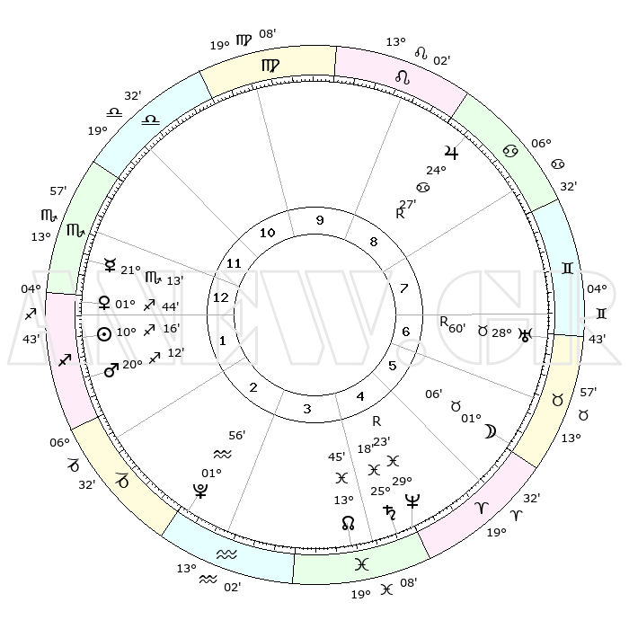 | | ΘΕΣΕΙΣ ΠΛΑΝΗΤΩΝ ΑΣΤΡΟΛΟΓΙΚΟΥ ΧΑΡΤΗ ΤΗΣ ΣΤΙΓΜΗΣ ΑΥΤΗΣ | | | | Πλανήτης | Ζώδιο | Μοίρες | Δεκαήμ. | Σε οίκο | Απόκλιση | | Ακμές των οίκων | | Ηλιος | Τοξότης | 10°14' | Δεύτερο | 1 | 21 S 59 | | 1ος | 26°34' | Σκορπιός | | Σελήνη | Ταύρος | 00°42' | Πρώτο | 5 | 15 N 07 | | 2ος | 27°15' | Τοξότης | | Ερμής | Σκορπιός | 21°13' | Τρίτο | 12 | 15 S 32 | | 3ος | 02°24' | Υδροχόος | | Αφροδίτη | Τοξότης | 01°42' | Πρώτο | 1 | 19 S 51 | | 4ος | 08°20' | Ιχθείς | | Αρης | Τοξότης | 20°11' | Τρίτο | 1 | 23 S 44 | | 5ος | 09°47' | Κριός | | Δίας | Καρκίνος | 24°27'R | Τρίτο | 8 | 21 N 23 | | 6ος | 05°18' | Ταύρος | | Κρόνος | Ιχθείς | 25°18' | Τρίτο | 4 | 04 S 02 | | 7ος | 26°34' | Ταύρος | | Ουρανός | Ταύρος | 28°60'R | Τρίτο | 7 | 19 N 44 | | 8ος | 27°15' | Δίδυμοι | | Ποσειδώνας | Ιχθείς | 29°23'R | Τρίτο | 4 | 01 S 29 | | 9ος | 02°24' | Λέων | | Πλούτωνας | Υδροχόος | 01°56' | Πρώτο | 2 | 23 S 24 | | 10ος | 08°20' | Παρθένος | | Β. Δεσμός | Ιχθείς | 13°45' | Δεύτερο | 4 | 06 S 23 | | 11ος | 09°47' | Ζυγός | | Ωροσκόπος | Σκορπιός | 26°34' | Τρίτο | | | 12ος | 05°18' | Σκορπιός | | Μεσουράνημα | Παρθένος | 08°20' | Πρώτο | | | |