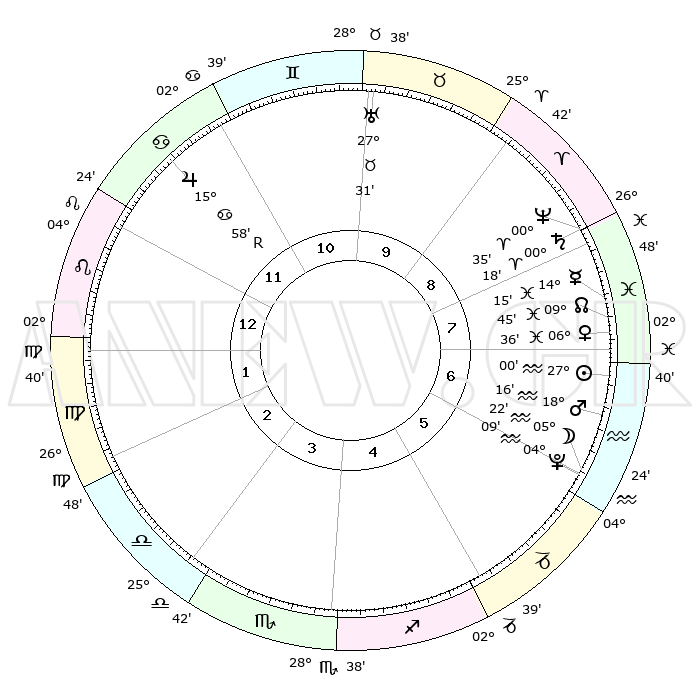 | | ΘΕΣΕΙΣ ΠΛΑΝΗΤΩΝ ΑΣΤΡΟΛΟΓΙΚΟΥ ΧΑΡΤΗ ΤΗΣ ΣΤΙΓΜΗΣ ΑΥΤΗΣ | | | | Πλανήτης | Ζώδιο | Μοίρες | Δεκαήμ. | Σε οίκο | Απόκλιση | | Ακμές των οίκων | | Ηλιος | Υδροχόος | 26°57' | Τρίτο | 7 | 12 S 32 | | 1ος | 16°56' | Λέων | | Σελήνη | Υδροχόος | 04°41' | Πρώτο | 6 | 21 S 59 | | 2ος | 09°26' | Παρθένος | | Ερμής | Ιχθείς | 14°11' | Δεύτερο | 8 | 06 S 03 | | 3ος | 06°43' | Ζυγός | | Αφροδίτη | Ιχθείς | 06°32' | Πρώτο | 7 | 10 S 29 | | 4ος | 09°15' | Σκορπιός | | Αρης | Υδροχόος | 18°13' | Δεύτερο | 7 | 16 S 23 | | 5ος | 14°23' | Τοξότης | | Δίας | Καρκίνος | 15°59'R | Δεύτερο | 11 | 22 N 48 | | 6ος | 17°37' | Αιγόκερως | | Κρόνος | Κριός | 00°18' | Πρώτο | 8 | 01 S 51 | | 7ος | 16°56' | Υδροχόος | | Ουρανός | Ταύρος | 27°31' | Τρίτο | 10 | 19 N 25 | | 8ος | 09°26' | Ιχθείς | | Ποσειδώνας | Κριός | 00°35' | Πρώτο | 8 | 00 S 58 | | 9ος | 06°43' | Κριός | | Πλούτωνας | Υδροχόος | 04°09' | Πρώτο | 6 | 22 S 56 | | 10ος | 09°15' | Ταύρος | | Β. Δεσμός | Ιχθείς | 09°45' | Πρώτο | 8 | 07 S 55 | | 11ος | 14°23' | Δίδυμοι | | Ωροσκόπος | Λέων | 16°56' | Δεύτερο | | | 12ος | 17°37' | Καρκίνος | | Μεσουράνημα | Ταύρος | 09°15' | Πρώτο | | | |