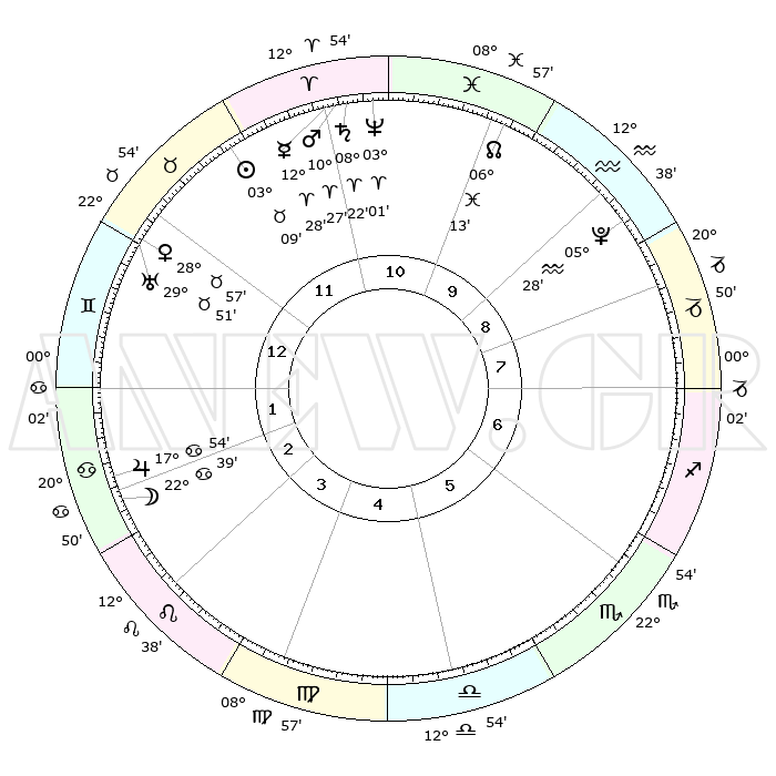 | | ΘΕΣΕΙΣ ΠΛΑΝΗΤΩΝ ΑΣΤΡΟΛΟΓΙΚΟΥ ΧΑΡΤΗ ΤΗΣ ΣΤΙΓΜΗΣ ΑΥΤΗΣ | | | | Πλανήτης | Ζώδιο | Μοίρες | Δεκαήμ. | Σε οίκο | Απόκλιση | | Ακμές των οίκων | | Ηλιος | Ταύρος | 03°06' | Πρώτο | 12 | 12 N 32 | | 1ος | 08°52' | Δίδυμοι | | Σελήνη | Καρκίνος | 21°49' | Τρίτο | 2 | 25 N 16 | | 2ος | 02°03' | Καρκίνος | | Ερμής | Κριός | 12°22' | Δεύτερο | 11 | 02 N 34 | | 3ος | 23°16' | Καρκίνος | | Αφροδίτη | Ταύρος | 28°52' | Τρίτο | 12 | 20 N 26 | | 4ος | 16°48' | Λέων | | Αρης | Κριός | 10°25' | Δεύτερο | 11 | 03 N 16 | | 5ος | 16°52' | Παρθένος | | Δίας | Καρκίνος | 17°54' | Δεύτερο | 2 | 22 N 37 | | 6ος | 26°28' | Ζυγός | | Κρόνος | Κριός | 08°22' | Πρώτο | 11 | 01 N 20 | | 7ος | 08°52' | Τοξότης | | Ουρανός | Ταύρος | 29°51' | Τρίτο | 12 | 19 N 57 | | 8ος | 02°03' | Αιγόκερως | | Ποσειδώνας | Κριός | 03°01' | Πρώτο | 11 | 00 S 01 | | 9ος | 23°16' | Αιγόκερως | | Πλούτωνας | Υδροχόος | 05°28' | Πρώτο | 9 | 22 S 48 | | 10ος | 16°48' | Υδροχόος | | Β. Δεσμός | Ιχθείς | 06°14' | Πρώτο | 10 | 09 S 14 | | 11ος | 16°52' | Ιχθείς | | Ωροσκόπος | Δίδυμοι | 08°52' | Πρώτο | | | 12ος | 26°29' | Κριός | | Μεσουράνημα | Υδροχόος | 16°48' | Δεύτερο | | | |