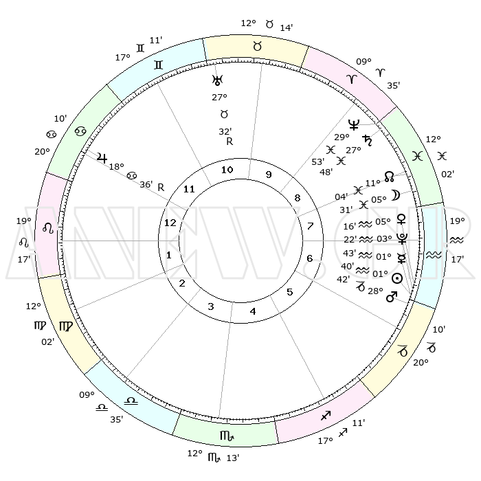 | | ΘΕΣΕΙΣ ΠΛΑΝΗΤΩΝ ΑΣΤΡΟΛΟΓΙΚΟΥ ΧΑΡΤΗ ΤΗΣ ΣΤΙΓΜΗΣ ΑΥΤΗΣ | | | | Πλανήτης | Ζώδιο | Μοίρες | Δεκαήμ. | Σε οίκο | Απόκλιση | | Ακμές των οίκων | | Ηλιος | Υδροχόος | 01°36' | Πρώτο | 7 | 19 S 48 | | 1ος | 27°55' | Καρκίνος | | Σελήνη | Ιχθείς | 04°33' | Πρώτο | 8 | 10 S 15 | | 2ος | 18°49' | Λέων | | Ερμής | Υδροχόος | 01°35' | Πρώτο | 7 | 21 S 48 | | 3ος | 13°35' | Παρθένος | | Αφροδίτη | Υδροχόος | 05°10' | Πρώτο | 7 | 20 S 06 | | 4ος | 14°21' | Ζυγός | | Αρης | Αιγόκερως | 28°39' | Τρίτο | 7 | 21 S 24 | | 5ος | 20°26' | Σκορπιός | | Δίας | Καρκίνος | 18°36'R | Δεύτερο | 12 | 22 N 25 | | 6ος | 26°29' | Τοξότης | | Κρόνος | Ιχθείς | 27°48' | Τρίτο | 9 | 02 S 54 | | 7ος | 27°55' | Αιγόκερως | | Ουρανός | Ταύρος | 27°32'R | Τρίτο | 11 | 19 N 25 | | 8ος | 18°49' | Υδροχόος | | Ποσειδώνας | Ιχθείς | 29°53' | Τρίτο | 9 | 01 S 16 | | 9ος | 13°35' | Ιχθείς | | Πλούτωνας | Υδροχόος | 03°22' | Πρώτο | 7 | 23 S 05 | | 10ος | 14°21' | Κριός | | Β. Δεσμός | Ιχθείς | 11°05' | Δεύτερο | 8 | 07 S 25 | | 11ος | 20°26' | Ταύρος | | Ωροσκόπος | Καρκίνος | 27°55' | Τρίτο | | | 12ος | 26°29' | Δίδυμοι | | Μεσουράνημα | Κριός | 14°21' | Δεύτερο | | | |
