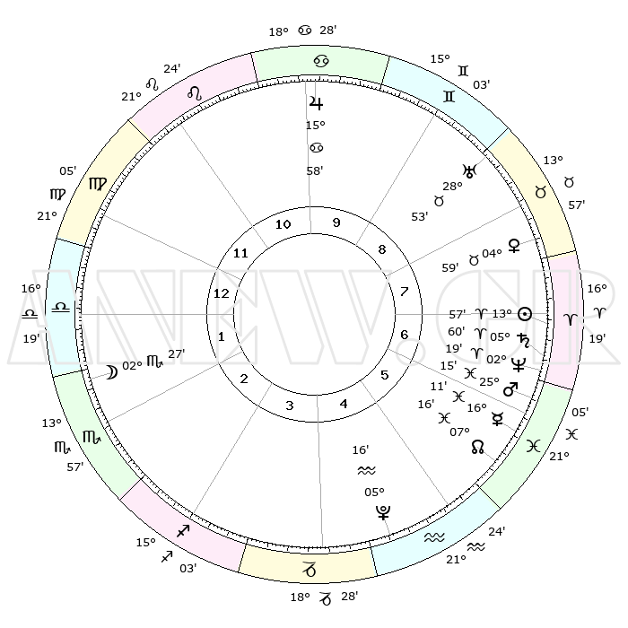 | | ΘΕΣΕΙΣ ΠΛΑΝΗΤΩΝ ΑΣΤΡΟΛΟΓΙΚΟΥ ΧΑΡΤΗ ΤΗΣ ΣΤΙΓΜΗΣ ΑΥΤΗΣ | | | | Πλανήτης | Ζώδιο | Μοίρες | Δεκαήμ. | Σε οίκο | Απόκλιση | | Ακμές των οίκων | | Ηλιος | Κριός | 13°54' | Δεύτερο | 7 | 05 N 29 | | 1ος | 29°08' | Παρθένος | | Σελήνη | Σκορπιός | 01°44' | Πρώτο | 2 | 15 S 58 | | 2ος | 25°40' | Ζυγός | | Ερμής | Ιχθείς | 16°07' | Δεύτερο | 6 | 07 S 02 | | 3ος | 26°04' | Σκορπιός | | Αφροδίτη | Ταύρος | 04°54' | Πρώτο | 8 | 12 N 50 | | 4ος | 29°02' | Τοξότης | | Αρης | Ιχθείς | 25°12' | Τρίτο | 6 | 02 S 51 | | 5ος | 02°01' | Υδροχόος | | Δίας | Καρκίνος | 15°58' | Δεύτερο | 10 | 22 N 51 | | 6ος | 02°29' | Ιχθείς | | Κρόνος | Κριός | 05°59' | Πρώτο | 7 | 00 N 25 | | 7ος | 29°08' | Ιχθείς | | Ουρανός | Ταύρος | 28°53' | Τρίτο | 9 | 19 N 44 | | 8ος | 25°40' | Κριός | | Ποσειδώνας | Κριός | 02°19' | Πρώτο | 7 | 00 S 17 | | 9ος | 26°04' | Ταύρος | | Πλούτωνας | Υδροχόος | 05°16' | Πρώτο | 5 | 22 S 47 | | 10ος | 29°02' | Δίδυμοι | | Β. Δεσμός | Ιχθείς | 07°16' | Πρώτο | 6 | 08 S 50 | | 11ος | 02°01' | Λέων | | Ωροσκόπος | Παρθένος | 29°08' | Τρίτο | | | 12ος | 02°29' | Παρθένος | | Μεσουράνημα | Δίδυμοι | 29°02' | Τρίτο | | | |