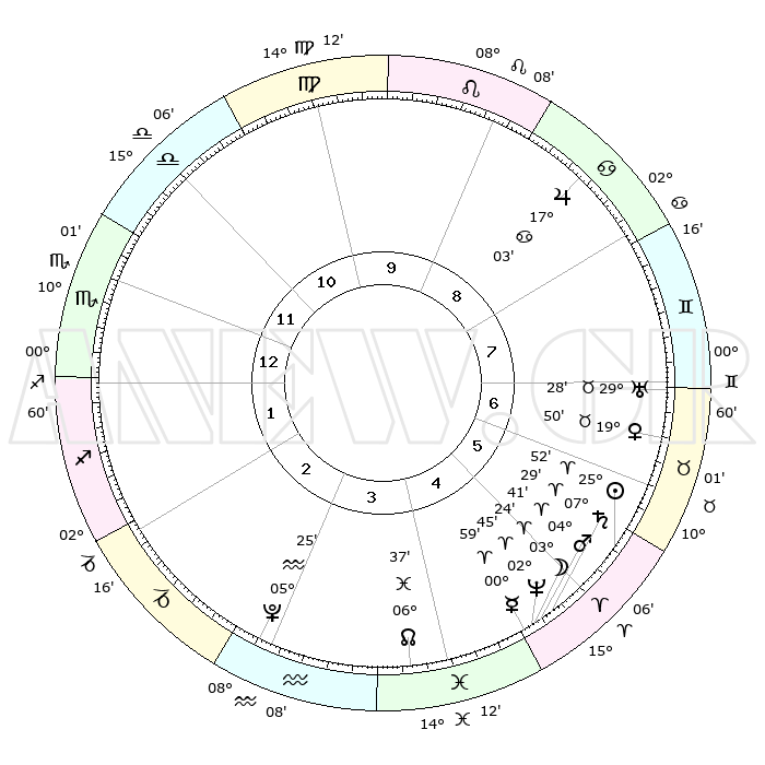 | | ΘΕΣΕΙΣ ΠΛΑΝΗΤΩΝ ΑΣΤΡΟΛΟΓΙΚΟΥ ΧΑΡΤΗ ΤΗΣ ΣΤΙΓΜΗΣ ΑΥΤΗΣ | | | | Πλανήτης | Ζώδιο | Μοίρες | Δεκαήμ. | Σε οίκο | Απόκλιση | | Ακμές των οίκων | | Ηλιος | Κριός | 25°48' | Τρίτο | 6 | 09 N 58 | | 1ος | 13°03' | Σκορπιός | | Σελήνη | Κριός | 02°31' | Πρώτο | 5 | 02 N 57 | | 2ος | 12°22' | Τοξότης | | Ερμής | Κριός | 00°54' | Πρώτο | 5 | 02 S 02 | | 3ος | 15°36' | Αιγόκερως | | Αφροδίτη | Ταύρος | 19°46' | Δεύτερο | 7 | 17 N 52 | | 4ος | 20°44' | Υδροχόος | | Αρης | Κριός | 04°38' | Πρώτο | 5 | 00 N 57 | | 5ος | 23°16' | Ιχθείς | | Δίας | Καρκίνος | 17°03' | Δεύτερο | 9 | 22 N 43 | | 6ος | 20°33' | Κριός | | Κρόνος | Κριός | 07°29' | Πρώτο | 5 | 01 N 00 | | 7ος | 13°03' | Ταύρος | | Ουρανός | Ταύρος | 29°28' | Τρίτο | 7 | 19 N 52 | | 8ος | 12°22' | Δίδυμοι | | Ποσειδώνας | Κριός | 02°45' | Πρώτο | 5 | 00 S 07 | | 9ος | 15°36' | Καρκίνος | | Πλούτωνας | Υδροχόος | 05°24' | Πρώτο | 3 | 22 S 47 | | 10ος | 20°44' | Λέων | | Β. Δεσμός | Ιχθείς | 06°37' | Πρώτο | 4 | 09 S 05 | | 11ος | 23°16' | Παρθένος | | Ωροσκόπος | Σκορπιός | 13°03' | Δεύτερο | | | 12ος | 20°33' | Ζυγός | | Μεσουράνημα | Λέων | 20°44' | Τρίτο | | | |
