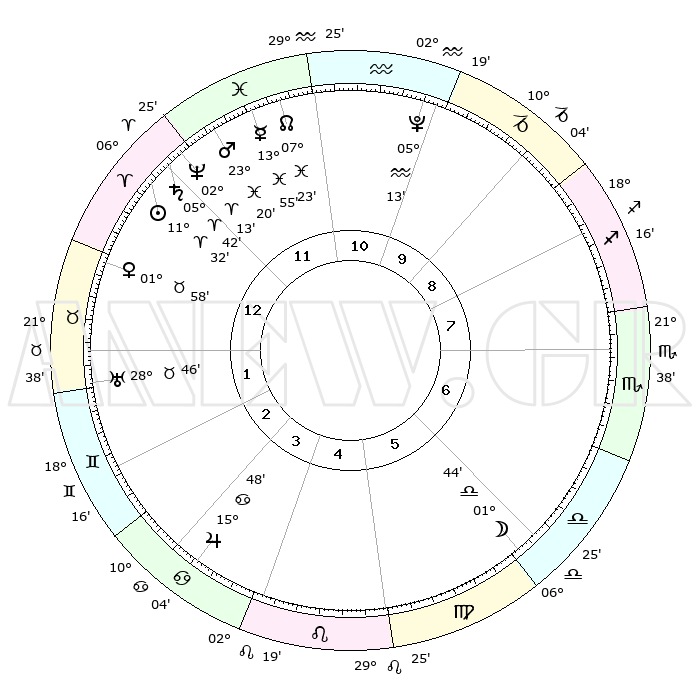 | | ΘΕΣΕΙΣ ΠΛΑΝΗΤΩΝ ΑΣΤΡΟΛΟΓΙΚΟΥ ΧΑΡΤΗ ΤΗΣ ΣΤΙΓΜΗΣ ΑΥΤΗΣ | | | | Πλανήτης | Ζώδιο | Μοίρες | Δεκαήμ. | Σε οίκο | Απόκλιση | | Ακμές των οίκων | | Ηλιος | Κριός | 11°29' | Δεύτερο | 12 | 04 N 32 | | 1ος | 23°42' | Κριός | | Σελήνη | Ζυγός | 01°02' | Πρώτο | 6 | 02 S 13 | | 2ος | 27°40' | Ταύρος | | Ερμής | Ιχθείς | 13°52' | Δεύτερο | 12 | 07 S 35 | | 3ος | 21°54' | Δίδυμοι | | Αφροδίτη | Ταύρος | 01°54' | Πρώτο | 1 | 11 N 43 | | 4ος | 13°36' | Καρκίνος | | Αρης | Ιχθείς | 23°17' | Τρίτο | 12 | 03 S 37 | | 5ος | 07°25' | Λέων | | Δίας | Καρκίνος | 15°48' | Δεύτερο | 4 | 22 N 52 | | 6ος | 08°55' | Παρθένος | | Κρόνος | Κριός | 05°41' | Πρώτο | 12 | 00 N 18 | | 7ος | 23°42' | Ζυγός | | Ουρανός | Ταύρος | 28°46' | Τρίτο | 2 | 19 N 43 | | 8ος | 27°40' | Σκορπιός | | Ποσειδώνας | Κριός | 02°13' | Πρώτο | 12 | 00 S 19 | | 9ος | 21°54' | Τοξότης | | Πλούτωνας | Υδροχόος | 05°13' | Πρώτο | 10 | 22 S 47 | | 10ος | 13°36' | Αιγόκερως | | Β. Δεσμός | Ιχθείς | 07°24' | Πρώτο | 11 | 08 S 48 | | 11ος | 07°25' | Υδροχόος | | Ωροσκόπος | Κριός | 23°42' | Τρίτο | | | 12ος | 08°55' | Ιχθείς | | Μεσουράνημα | Αιγόκερως | 13°36' | Δεύτερο | | | |