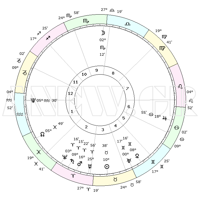 | | ΘΕΣΕΙΣ ΠΛΑΝΗΤΩΝ ΑΣΤΡΟΛΟΓΙΚΟΥ ΧΑΡΤΗ ΤΗΣ ΣΤΙΓΜΗΣ ΑΥΤΗΣ | | | | Πλανήτης | Ζώδιο | Μοίρες | Δεκαήμ. | Σε οίκο | Απόκλιση | | Ακμές των οίκων | | Ηλιος | Ταύρος | 10°35' | Δεύτερο | 4 | 15 N 00 | | 1ος | 15°23' | Αιγόκερως | | Σελήνη | Σκορπιός | 01°37' | Πρώτο | 9 | 15 S 54 | | 2ος | 26°26' | Υδροχόος | | Ερμής | Κριός | 25°51' | Τρίτο | 3 | 08 N 11 | | 3ος | 06°31' | Κριός | | Αφροδίτη | Δίδυμοι | 08°12' | Πρώτο | 5 | 22 N 33 | | 4ος | 07°41' | Ταύρος | | Αρης | Κριός | 16°19' | Δεύτερο | 3 | 05 N 36 | | 5ος | 01°51' | Δίδυμοι | | Δίας | Καρκίνος | 18°54' | Δεύτερο | 7 | 22 N 29 | | 6ος | 23°04' | Δίδυμοι | | Κρόνος | Κριός | 09°15' | Πρώτο | 3 | 01 N 40 | | 7ος | 15°23' | Καρκίνος | | Ουρανός | Δίδυμοι | 00°16' | Πρώτο | 4 | 20 N 03 | | 8ος | 26°26' | Λέων | | Ποσειδώνας | Κριός | 03°16' | Πρώτο | 2 | 00 N 05 | | 9ος | 06°31' | Ζυγός | | Πλούτωνας | Υδροχόος | 05°30' | Πρώτο | 1 | 22 S 49 | | 10ος | 07°41' | Σκορπιός | | Β. Δεσμός | Ιχθείς | 05°49' | Πρώτο | 2 | 09 S 23 | | 11ος | 01°51' | Τοξότης | | Ωροσκόπος | Αιγόκερως | 15°23' | Δεύτερο | | | 12ος | 23°04' | Τοξότης | | Μεσουράνημα | Σκορπιός | 07°41' | Πρώτο | | | |