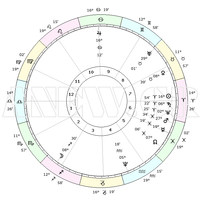 | | ΘΕΣΕΙΣ ΠΛΑΝΗΤΩΝ ΑΣΤΡΟΛΟΓΙΚΟΥ ΧΑΡΤΗ ΤΗΣ ΣΤΙΓΜΗΣ ΑΥΤΗΣ | | | | Πλανήτης | Ζώδιο | Μοίρες | Δεκαήμ. | Σε οίκο | Απόκλιση | | Ακμές των οίκων | | Ηλιος | Κριός | 16°50' | Δεύτερο | 7 | 06 N 37 | | 1ος | 27°03' | Παρθένος | | Σελήνη | Τοξότης | 07°48' | Πρώτο | 3 | 26 S 42 | | 2ος | 23°25' | Ζυγός | | Ερμής | Ιχθείς | 19°15' | Δεύτερο | 6 | 06 S 08 | | 3ος | 23°44' | Σκορπιός | | Αφροδίτη | Ταύρος | 08°35' | Πρώτο | 8 | 14 N 10 | | 4ος | 26°41' | Τοξότης | | Αρης | Ιχθείς | 27°32' | Τρίτο | 7 | 01 S 55 | | 5ος | 29°42' | Αιγόκερως | | Δίας | Καρκίνος | 16°12' | Δεύτερο | 10 | 22 N 49 | | 6ος | 00°15' | Ιχθείς | | Κρόνος | Κριός | 06°22' | Πρώτο | 7 | 00 N 34 | | 7ος | 27°03' | Ιχθείς | | Ουρανός | Ταύρος | 29°01' | Τρίτο | 9 | 19 N 46 | | 8ος | 23°25' | Κριός | | Ποσειδώνας | Κριός | 02°25' | Πρώτο | 7 | 00 S 14 | | 9ος | 23°44' | Ταύρος | | Πλούτωνας | Υδροχόος | 05°18' | Πρώτο | 5 | 22 S 47 | | 10ος | 26°41' | Δίδυμοι | | Β. Δεσμός | Ιχθείς | 07°06' | Πρώτο | 6 | 08 S 54 | | 11ος | 29°42' | Καρκίνος | | Ωροσκόπος | Παρθένος | 27°03' | Τρίτο | | | 12ος | 00°15' | Παρθένος | | Μεσουράνημα | Δίδυμοι | 26°41' | Τρίτο | | | |
