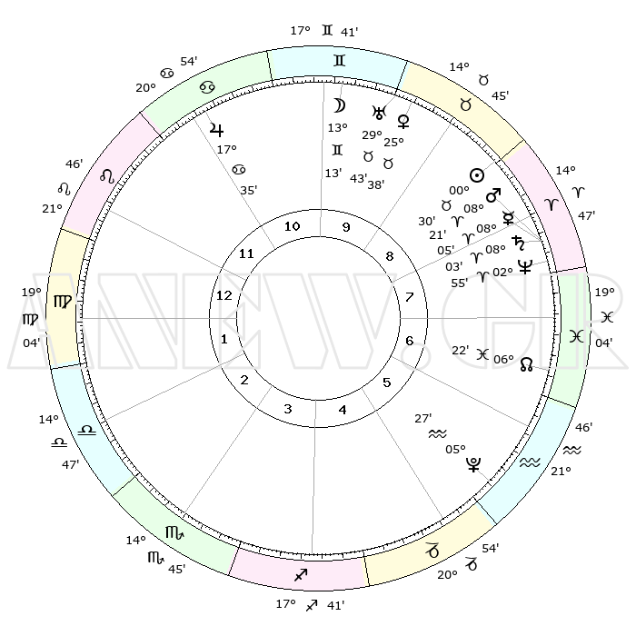 | | ΘΕΣΕΙΣ ΠΛΑΝΗΤΩΝ ΑΣΤΡΟΛΟΓΙΚΟΥ ΧΑΡΤΗ ΤΗΣ ΣΤΙΓΜΗΣ ΑΥΤΗΣ | | | | Πλανήτης | Ζώδιο | Μοίρες | Δεκαήμ. | Σε οίκο | Απόκλιση | | Ακμές των οίκων | | Ηλιος | Ταύρος | 00°26' | Πρώτο | 9 | 11 N 37 | | 1ος | 02°11' | Παρθένος | | Σελήνη | Δίδυμοι | 12°22' | Δεύτερο | 10 | 27 N 18 | | 2ος | 26°16' | Παρθένος | | Ερμής | Κριός | 07°60' | Πρώτο | 8 | 00 N 46 | | 3ος | 25°08' | Ζυγός | | Αφροδίτη | Ταύρος | 25°33' | Τρίτο | 9 | 19 N 33 | | 4ος | 28°04' | Σκορπιός | | Αρης | Κριός | 08°19' | Πρώτο | 8 | 02 N 25 | | 5ος | 02°07' | Αιγόκερως | | Δίας | Καρκίνος | 17°34' | Δεύτερο | 11 | 22 N 40 | | 6ος | 03°54' | Υδροχόος | | Κρόνος | Κριός | 08°03' | Πρώτο | 8 | 01 N 13 | | 7ος | 02°11' | Ιχθείς | | Ουρανός | Ταύρος | 29°42' | Τρίτο | 10 | 19 N 55 | | 8ος | 26°16' | Ιχθείς | | Ποσειδώνας | Κριός | 02°55' | Πρώτο | 8 | 00 S 03 | | 9ος | 25°08' | Κριός | | Πλούτωνας | Υδροχόος | 05°27' | Πρώτο | 6 | 22 S 48 | | 10ος | 28°04' | Ταύρος | | Β. Δεσμός | Ιχθείς | 06°22' | Πρώτο | 7 | 09 S 10 | | 11ος | 02°07' | Καρκίνος | | Ωροσκόπος | Παρθένος | 02°11' | Πρώτο | | | 12ος | 03°54' | Λέων | | Μεσουράνημα | Ταύρος | 28°04' | Τρίτο | | | |