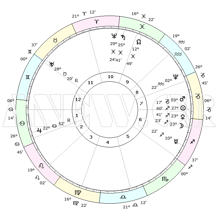 | | ΘΕΣΕΙΣ ΠΛΑΝΗΤΩΝ ΑΣΤΡΟΛΟΓΙΚΟΥ ΧΑΡΤΗ ΤΗΣ ΣΤΙΓΜΗΣ ΑΥΤΗΣ | | | | Πλανήτης | Ζώδιο | Μοίρες | Δεκαήμ. | Σε οίκο | Απόκλιση | | Ακμές των οίκων | | Ηλιος | Τοξότης | 27°55' | Τρίτο | 7 | 23 S 25 | | 1ος | 11°26' | Δίδυμοι | | Σελήνη | Τοξότης | 22°31' | Τρίτο | 7 | 28 S 08 | | 2ος | 04°12' | Καρκίνος | | Ερμής | Τοξότης | 10°16' | Δεύτερο | 6 | 21 S 03 | | 3ος | 25°25' | Καρκίνος | | Αφροδίτη | Τοξότης | 23°35' | Τρίτο | 7 | 23 S 18 | | 4ος | 19°13' | Λέων | | Αρης | Αιγόκερως | 03°14' | Πρώτο | 7 | 24 S 12 | | 5ος | 19°46' | Παρθένος | | Δίας | Καρκίνος | 22°52'R | Τρίτο | 2 | 21 N 42 | | 6ος | 29°37' | Ζυγός | | Κρόνος | Ιχθείς | 25°41' | Τρίτο | 11 | 03 S 50 | | 7ος | 11°26' | Τοξότης | | Ουρανός | Ταύρος | 28°20'R | Τρίτο | 12 | 19 N 35 | | 8ος | 04°12' | Αιγόκερως | | Ποσειδώνας | Ιχθείς | 29°24' | Τρίτο | 11 | 01 S 28 | | 9ος | 25°25' | Αιγόκερως | | Πλούτωνας | Υδροχόος | 02°22' | Πρώτο | 9 | 23 S 18 | | 10ος | 19°13' | Υδροχόος | | Β. Δεσμός | Ιχθείς | 12°50' | Δεύτερο | 10 | 06 S 45 | | 11ος | 19°46' | Ιχθείς | | Ωροσκόπος | Δίδυμοι | 11°26' | Δεύτερο | | | 12ος | 29°37' | Κριός | | Μεσουράνημα | Υδροχόος | 19°13' | Δεύτερο | | | |