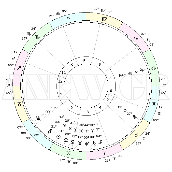 | | ΘΕΣΕΙΣ ΠΛΑΝΗΤΩΝ ΑΣΤΡΟΛΟΓΙΚΟΥ ΧΑΡΤΗ ΤΗΣ ΣΤΙΓΜΗΣ ΑΥΤΗΣ | | | | Πλανήτης | Ζώδιο | Μοίρες | Δεκαήμ. | Σε οίκο | Απόκλιση | | Ακμές των οίκων | | Ηλιος | Ιχθείς | 01°22' | Πρώτο | 3 | 10 S 59 | | 1ος | 09°22' | Τοξότης | | Σελήνη | Κριός | 02°34' | Πρώτο | 4 | 02 N 58 | | 2ος | 11°58' | Αιγόκερως | | Ερμής | Ιχθείς | 19°26' | Δεύτερο | 3 | 03 S 02 | | 3ος | 19°16' | Υδροχόος | | Αφροδίτη | Ιχθείς | 11°60' | Δεύτερο | 3 | 08 S 24 | | 4ος | 25°16' | Ιχθείς | | Αρης | Υδροχόος | 21°40' | Τρίτο | 3 | 15 S 19 | | 5ος | 24°59' | Κριός | | Δίας | Καρκίνος | 15°41'R | Δεύτερο | 8 | 22 N 51 | | 6ος | 18°48' | Ταύρος | | Κρόνος | Κριός | 00°47' | Πρώτο | 4 | 01 S 39 | | 7ος | 09°22' | Δίδυμοι | | Ουρανός | Ταύρος | 27°34' | Τρίτο | 6 | 19 N 26 | | 8ος | 11°58' | Καρκίνος | | Ποσειδώνας | Κριός | 00°44' | Πρώτο | 4 | 00 S 55 | | 9ος | 19°16' | Λέων | | Πλούτωνας | Υδροχόος | 04°17' | Πρώτο | 2 | 22 S 55 | | 10ος | 25°16' | Παρθένος | | Β. Δεσμός | Ιχθείς | 09°31' | Πρώτο | 3 | 08 S 00 | | 11ος | 24°59' | Ζυγός | | Ωροσκόπος | Τοξότης | 09°22' | Πρώτο | | | 12ος | 18°48' | Σκορπιός | | Μεσουράνημα | Παρθένος | 25°16' | Τρίτο | | | |