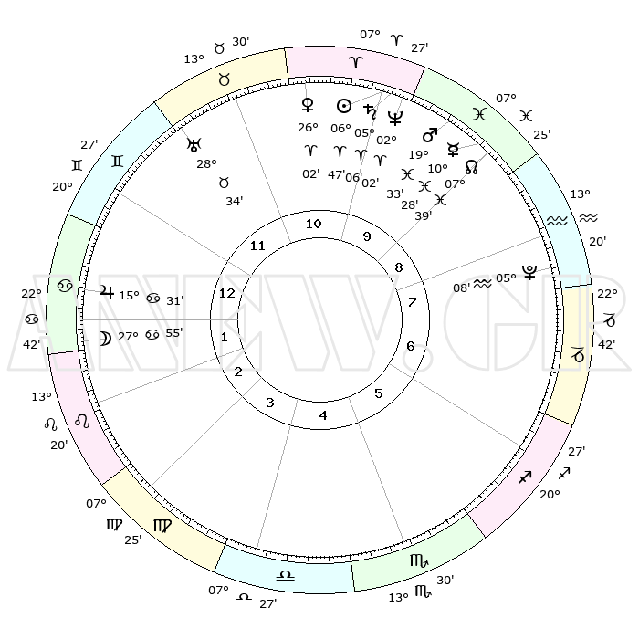 | | ΘΕΣΕΙΣ ΠΛΑΝΗΤΩΝ ΑΣΤΡΟΛΟΓΙΚΟΥ ΧΑΡΤΗ ΤΗΣ ΣΤΙΓΜΗΣ ΑΥΤΗΣ | | | | Πλανήτης | Ζώδιο | Μοίρες | Δεκαήμ. | Σε οίκο | Απόκλιση | | Ακμές των οίκων | | Ηλιος | Κριός | 06°43' | Πρώτο | 10 | 02 N 40 | | 1ος | 03°38' | Καρκίνος | | Σελήνη | Καρκίνος | 27°04' | Τρίτο | 2 | 24 N 09 | | 2ος | 24°15' | Καρκίνος | | Ερμής | Ιχθείς | 10°26' | Δεύτερο | 9 | 08 S 06 | | 3ος | 16°18' | Λέων | | Αφροδίτη | Κριός | 25°57' | Τρίτο | 11 | 09 N 26 | | 4ος | 13°12' | Παρθένος | | Αρης | Ιχθείς | 19°30' | Δεύτερο | 10 | 05 S 08 | | 5ος | 17°42' | Ζυγός | | Δίας | Καρκίνος | 15°31' | Δεύτερο | 1 | 22 N 54 | | 6ος | 27°23' | Σκορπιός | | Κρόνος | Κριός | 05°05' | Πρώτο | 10 | 00 N 04 | | 7ος | 03°38' | Αιγόκερως | | Ουρανός | Ταύρος | 28°34' | Τρίτο | 12 | 19 N 40 | | 8ος | 24°15' | Αιγόκερως | | Ποσειδώνας | Κριός | 02°02' | Πρώτο | 10 | 00 S 23 | | 9ος | 16°18' | Υδροχόος | | Πλούτωνας | Υδροχόος | 05°08' | Πρώτο | 8 | 22 S 48 | | 10ος | 13°12' | Ιχθείς | | Β. Δεσμός | Ιχθείς | 07°39' | Πρώτο | 9 | 08 S 42 | | 11ος | 17°42' | Κριός | | Ωροσκόπος | Καρκίνος | 03°38' | Πρώτο | | | 12ος | 27°23' | Ταύρος | | Μεσουράνημα | Ιχθείς | 13°12' | Δεύτερο | | | |
