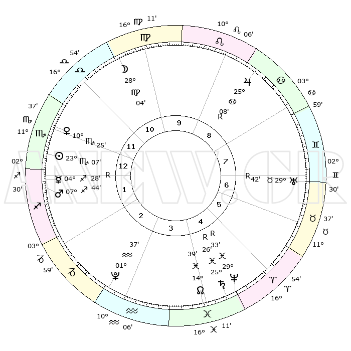| | ΘΕΣΕΙΣ ΠΛΑΝΗΤΩΝ ΑΣΤΡΟΛΟΓΙΚΟΥ ΧΑΡΤΗ ΤΗΣ ΣΤΙΓΜΗΣ ΑΥΤΗΣ | | | | Πλανήτης | Ζώδιο | Μοίρες | Δεκαήμ. | Σε οίκο | Απόκλιση | | Ακμές των οίκων | | Ηλιος | Σκορπιός | 23°02' | Τρίτο | 1 | 18 S 31 | | 1ος | 06°17' | Σκορπιός | | Σελήνη | Παρθένος | 26°58' | Τρίτο | 11 | 00 N 20 | | 2ος | 05°06' | Τοξότης | | Ερμής | Τοξότης | 04°33'R | Πρώτο | 1 | 22 S 12 | | 3ος | 07°36' | Αιγόκερως | | Αφροδίτη | Σκορπιός | 10°18' | Δεύτερο | 1 | 13 S 46 | | 4ος | 12°14' | Υδροχόος | | Αρης | Τοξότης | 07°40' | Πρώτο | 2 | 22 S 06 | | 5ος | 15°02' | Ιχθείς | | Δίας | Καρκίνος | 25°08'R | Τρίτο | 9 | 21 N 13 | | 6ος | 13°05' | Κριός | | Κρόνος | Ιχθείς | 25°26'R | Τρίτο | 5 | 04 S 02 | | 7ος | 06°17' | Ταύρος | | Ουρανός | Ταύρος | 29°42'R | Τρίτο | 7 | 19 N 53 | | 8ος | 05°06' | Δίδυμοι | | Ποσειδώνας | Ιχθείς | 29°33'R | Τρίτο | 5 | 01 S 26 | | 9ος | 07°36' | Καρκίνος | | Πλούτωνας | Υδροχόος | 01°37' | Πρώτο | 3 | 23 S 28 | | 10ος | 12°14' | Λέων | | Β. Δεσμός | Ιχθείς | 14°39' | Δεύτερο | 4 | 06 S 03 | | 11ος | 15°02' | Παρθένος | | Ωροσκόπος | Σκορπιός | 06°17' | Πρώτο | | | 12ος | 13°05' | Ζυγός | | Μεσουράνημα | Λέων | 12°14' | Δεύτερο | | | |