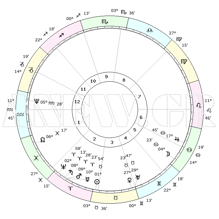 | | ΘΕΣΕΙΣ ΠΛΑΝΗΤΩΝ ΑΣΤΡΟΛΟΓΙΚΟΥ ΧΑΡΤΗ ΤΗΣ ΣΤΙΓΜΗΣ ΑΥΤΗΣ | | | | Πλανήτης | Ζώδιο | Μοίρες | Δεκαήμ. | Σε οίκο | Απόκλιση | | Ακμές των οίκων | | Ηλιος | Ταύρος | 01°50' | Πρώτο | 3 | 12 N 06 | | 1ος | 12°13' | Αιγόκερως | | Σελήνη | Καρκίνος | 03°21' | Πρώτο | 6 | 27 N 59 | | 2ος | 22°29' | Υδροχόος | | Ερμής | Κριός | 10°16' | Δεύτερο | 3 | 01 N 42 | | 3ος | 02°43' | Κριός | | Αφροδίτη | Ταύρος | 27°18' | Τρίτο | 4 | 20 N 02 | | 4ος | 04°29' | Ταύρος | | Αρης | Κριός | 09°25' | Πρώτο | 3 | 02 N 52 | | 5ος | 29°02' | Ταύρος | | Δίας | Καρκίνος | 17°44' | Δεύτερο | 7 | 22 N 38 | | 6ος | 20°19' | Δίδυμοι | | Κρόνος | Κριός | 08°13' | Πρώτο | 3 | 01 N 17 | | 7ος | 12°13' | Καρκίνος | | Ουρανός | Ταύρος | 29°47' | Τρίτο | 5 | 19 N 56 | | 8ος | 22°29' | Λέων | | Ποσειδώνας | Κριός | 02°58' | Πρώτο | 3 | 00 S 02 | | 9ος | 02°43' | Ζυγός | | Πλούτωνας | Υδροχόος | 05°28' | Πρώτο | 1 | 22 S 48 | | 10ος | 04°29' | Σκορπιός | | Β. Δεσμός | Ιχθείς | 06°18' | Πρώτο | 2 | 09 S 12 | | 11ος | 29°02' | Σκορπιός | | Ωροσκόπος | Αιγόκερως | 12°13' | Δεύτερο | | | 12ος | 20°19' | Τοξότης | | Μεσουράνημα | Σκορπιός | 04°29' | Πρώτο | | | |