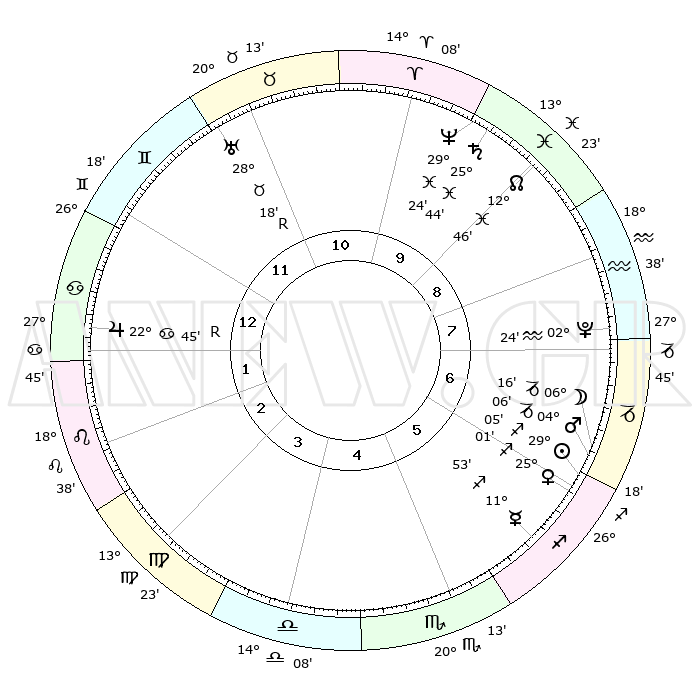 | | ΘΕΣΕΙΣ ΠΛΑΝΗΤΩΝ ΑΣΤΡΟΛΟΓΙΚΟΥ ΧΑΡΤΗ ΤΗΣ ΣΤΙΓΜΗΣ ΑΥΤΗΣ | | | | Πλανήτης | Ζώδιο | Μοίρες | Δεκαήμ. | Σε οίκο | Απόκλιση | | Ακμές των οίκων | | Ηλιος | Τοξότης | 28°60' | Τρίτο | 6 | 23 S 26 | | 1ος | 01°58' | Καρκίνος | | Σελήνη | Αιγόκερως | 05°14' | Πρώτο | 7 | 27 S 55 | | 2ος | 22°39' | Καρκίνος | | Ερμής | Τοξότης | 11°46' | Δεύτερο | 6 | 21 S 23 | | 3ος | 14°35' | Λέων | | Αφροδίτη | Τοξότης | 24°55' | Τρίτο | 6 | 23 S 24 | | 4ος | 11°13' | Παρθένος | | Αρης | Αιγόκερως | 04°02' | Πρώτο | 7 | 24 S 11 | | 5ος | 15°28' | Ζυγός | | Δίας | Καρκίνος | 22°45'R | Τρίτο | 2 | 21 N 43 | | 6ος | 25°19' | Σκορπιός | | Κρόνος | Ιχθείς | 25°44' | Τρίτο | 10 | 03 S 48 | | 7ος | 01°58' | Αιγόκερως | | Ουρανός | Ταύρος | 28°18'R | Τρίτο | 12 | 19 N 35 | | 8ος | 22°39' | Αιγόκερως | | Ποσειδώνας | Ιχθείς | 29°24' | Τρίτο | 10 | 01 S 28 | | 9ος | 14°35' | Υδροχόος | | Πλούτωνας | Υδροχόος | 02°24' | Πρώτο | 8 | 23 S 17 | | 10ος | 11°13' | Ιχθείς | | Β. Δεσμός | Ιχθείς | 12°46' | Δεύτερο | 10 | 06 S 46 | | 11ος | 15°28' | Κριός | | Ωροσκόπος | Καρκίνος | 01°58' | Πρώτο | | | 12ος | 25°19' | Ταύρος | | Μεσουράνημα | Ιχθείς | 11°13' | Δεύτερο | | | |