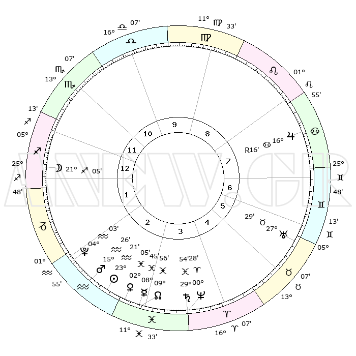 | | ΘΕΣΕΙΣ ΠΛΑΝΗΤΩΝ ΑΣΤΡΟΛΟΓΙΚΟΥ ΧΑΡΤΗ ΤΗΣ ΣΤΙΓΜΗΣ ΑΥΤΗΣ | | | | Πλανήτης | Ζώδιο | Μοίρες | Δεκαήμ. | Σε οίκο | Απόκλιση | | Ακμές των οίκων | | Ηλιος | Υδροχόος | 23°18' | Τρίτο | 3 | 13 S 45 | | 1ος | 06°23' | Τοξότης | | Σελήνη | Τοξότης | 20°20' | Τρίτο | 1 | 28 S 13 | | 2ος | 08°28' | Αιγόκερως | | Ερμής | Ιχθείς | 08°39' | Πρώτο | 3 | 08 S 50 | | 3ος | 15°15' | Υδροχόος | | Αφροδίτη | Ιχθείς | 01°60' | Πρώτο | 3 | 12 S 08 | | 4ος | 21°20' | Ιχθείς | | Αρης | Υδροχόος | 15°23' | Δεύτερο | 3 | 17 S 15 | | 5ος | 21°30' | Κριός | | Δίας | Καρκίνος | 16°16'R | Δεύτερο | 8 | 22 N 46 | | 6ος | 15°42' | Ταύρος | | Κρόνος | Ιχθείς | 29°54' | Τρίτο | 4 | 02 S 01 | | 7ος | 06°23' | Δίδυμοι | | Ουρανός | Ταύρος | 27°29' | Τρίτο | 6 | 19 N 25 | | 8ος | 08°28' | Καρκίνος | | Ποσειδώνας | Κριός | 00°28' | Πρώτο | 4 | 01 S 01 | | 9ος | 15°15' | Λέων | | Πλούτωνας | Υδροχόος | 04°03' | Πρώτο | 2 | 22 S 57 | | 10ος | 21°20' | Παρθένος | | Β. Δεσμός | Ιχθείς | 09°57' | Πρώτο | 3 | 07 S 50 | | 11ος | 21°30' | Ζυγός | | Ωροσκόπος | Τοξότης | 06°23' | Πρώτο | | | 12ος | 15°42' | Σκορπιός | | Μεσουράνημα | Παρθένος | 21°20' | Τρίτο | | | |