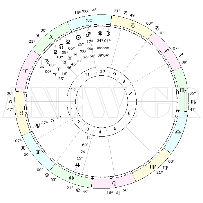 | | ΘΕΣΕΙΣ ΠΛΑΝΗΤΩΝ ΑΣΤΡΟΛΟΓΙΚΟΥ ΧΑΡΤΗ ΤΗΣ ΣΤΙΓΜΗΣ ΑΥΤΗΣ | | | | Πλανήτης | Ζώδιο | Μοίρες | Δεκαήμ. | Σε οίκο | Απόκλιση | | Ακμές των οίκων | | Ηλιος | Υδροχόος | 26°36' | Τρίτο | 12 | 12 S 39 | | 1ος | 04°55' | Κριός | | Σελήνη | Υδροχόος | 00°21' | Πρώτο | 11 | 23 S 17 | | 2ος | 13°59' | Ταύρος | | Ερμής | Ιχθείς | 13°42' | Δεύτερο | 12 | 06 S 18 | | 3ος | 10°39' | Δίδυμοι | | Αφροδίτη | Ιχθείς | 06°06' | Πρώτο | 12 | 10 S 38 | | 4ος | 02°46' | Καρκίνος | | Αρης | Υδροχόος | 17°57' | Δεύτερο | 11 | 16 S 28 | | 5ος | 25°18' | Καρκίνος | | Δίας | Καρκίνος | 16°00'R | Δεύτερο | 4 | 22 N 48 | | 6ος | 23°29' | Λέων | | Κρόνος | Κριός | 00°15' | Πρώτο | 12 | 01 S 52 | | 7ος | 04°55' | Ζυγός | | Ουρανός | Ταύρος | 27°31' | Τρίτο | 2 | 19 N 25 | | 8ος | 13°59' | Σκορπιός | | Ποσειδώνας | Κριός | 00°35' | Πρώτο | 12 | 00 S 58 | | 9ος | 10°39' | Τοξότης | | Πλούτωνας | Υδροχόος | 04°09' | Πρώτο | 11 | 22 S 56 | | 10ος | 02°46' | Αιγόκερως | | Β. Δεσμός | Ιχθείς | 09°46' | Πρώτο | 12 | 07 S 54 | | 11ος | 25°18' | Αιγόκερως | | Ωροσκόπος | Κριός | 04°55' | Πρώτο | | | 12ος | 23°29' | Υδροχόος | | Μεσουράνημα | Αιγόκερως | 02°46' | Πρώτο | | | |