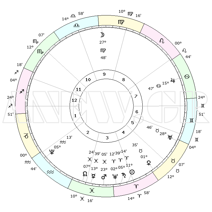 | | ΘΕΣΕΙΣ ΠΛΑΝΗΤΩΝ ΑΣΤΡΟΛΟΓΙΚΟΥ ΧΑΡΤΗ ΤΗΣ ΣΤΙΓΜΗΣ ΑΥΤΗΣ | | | | Πλανήτης | Ζώδιο | Μοίρες | Δεκαήμ. | Σε οίκο | Απόκλιση | | Ακμές των οίκων | | Ηλιος | Κριός | 11°10' | Δεύτερο | 4 | 04 N 25 | | 1ος | 04°28' | Τοξότης | | Σελήνη | Παρθένος | 26°56' | Τρίτο | 10 | 00 S 17 | | 2ος | 06°16' | Αιγόκερως | | Ερμής | Ιχθείς | 13°36' | Δεύτερο | 3 | 07 S 38 | | 3ος | 12°43' | Υδροχόος | | Αφροδίτη | Ταύρος | 01°30' | Πρώτο | 5 | 11 N 34 | | 4ος | 18°49' | Ιχθείς | | Αρης | Ιχθείς | 23°02' | Τρίτο | 4 | 03 S 43 | | 5ος | 19°15' | Κριός | | Δίας | Καρκίνος | 15°46' | Δεύτερο | 8 | 22 N 52 | | 6ος | 13°42' | Ταύρος | | Κρόνος | Κριός | 05°39' | Πρώτο | 4 | 00 N 17 | | 7ος | 04°28' | Δίδυμοι | | Ουρανός | Ταύρος | 28°45' | Τρίτο | 6 | 19 N 43 | | 8ος | 06°16' | Καρκίνος | | Ποσειδώνας | Κριός | 02°12' | Πρώτο | 4 | 00 S 19 | | 9ος | 12°43' | Λέων | | Πλούτωνας | Υδροχόος | 05°13' | Πρώτο | 2 | 22 S 47 | | 10ος | 18°49' | Παρθένος | | Β. Δεσμός | Ιχθείς | 07°25' | Πρώτο | 3 | 08 S 47 | | 11ος | 19°15' | Ζυγός | | Ωροσκόπος | Τοξότης | 04°28' | Πρώτο | | | 12ος | 13°42' | Σκορπιός | | Μεσουράνημα | Παρθένος | 18°49' | Δεύτερο | | | |