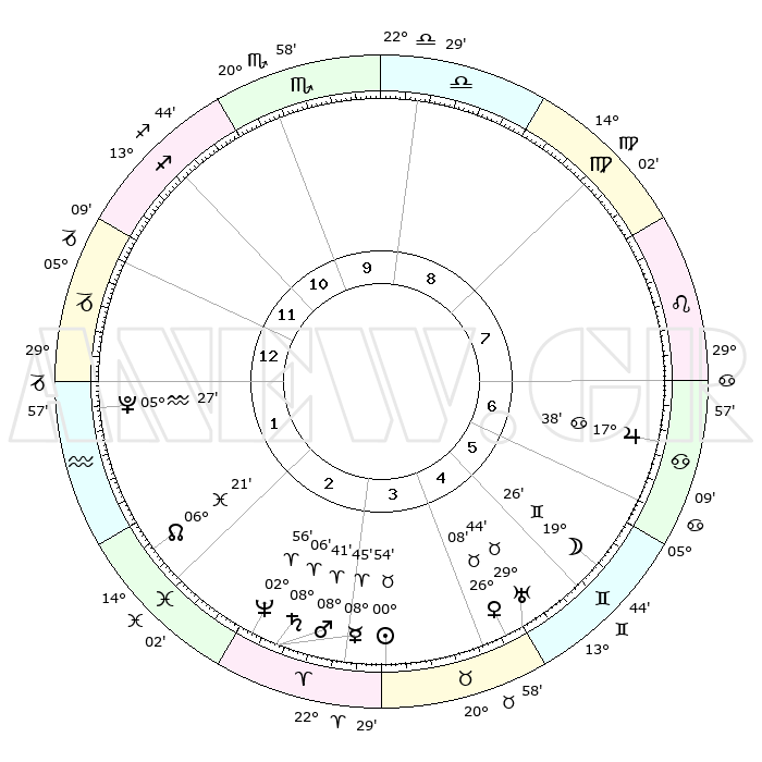 | | ΘΕΣΕΙΣ ΠΛΑΝΗΤΩΝ ΑΣΤΡΟΛΟΓΙΚΟΥ ΧΑΡΤΗ ΤΗΣ ΣΤΙΓΜΗΣ ΑΥΤΗΣ | | | | Πλανήτης | Ζώδιο | Μοίρες | Δεκαήμ. | Σε οίκο | Απόκλιση | | Ακμές των οίκων | | Ηλιος | Ταύρος | 00°50' | Πρώτο | 4 | 11 N 46 | | 1ος | 04°53' | Αιγόκερως | | Σελήνη | Δίδυμοι | 18°28' | Δεύτερο | 6 | 27 N 55 | | 2ος | 13°17' | Υδροχόος | | Ερμής | Κριός | 08°39' | Πρώτο | 3 | 01 N 02 | | 3ος | 23°32' | Ιχθείς | | Αφροδίτη | Ταύρος | 26°04' | Τρίτο | 5 | 19 N 42 | | 4ος | 26°39' | Κριός | | Αρης | Κριός | 08°38' | Πρώτο | 3 | 02 N 33 | | 5ος | 22°12' | Ταύρος | | Δίας | Καρκίνος | 17°37' | Δεύτερο | 7 | 22 N 39 | | 6ος | 13°44' | Δίδυμοι | | Κρόνος | Κριός | 08°06' | Πρώτο | 3 | 01 N 14 | | 7ος | 04°53' | Καρκίνος | | Ουρανός | Ταύρος | 29°44' | Τρίτο | 5 | 19 N 56 | | 8ος | 13°17' | Λέων | | Ποσειδώνας | Κριός | 02°56' | Πρώτο | 3 | 00 S 02 | | 9ος | 23°32' | Παρθένος | | Πλούτωνας | Υδροχόος | 05°27' | Πρώτο | 1 | 22 S 48 | | 10ος | 26°39' | Ζυγός | | Β. Δεσμός | Ιχθείς | 06°21' | Πρώτο | 2 | 09 S 11 | | 11ος | 22°12' | Σκορπιός | | Ωροσκόπος | Αιγόκερως | 04°53' | Πρώτο | | | 12ος | 13°44' | Τοξότης | | Μεσουράνημα | Ζυγός | 26°39' | Τρίτο | | | |