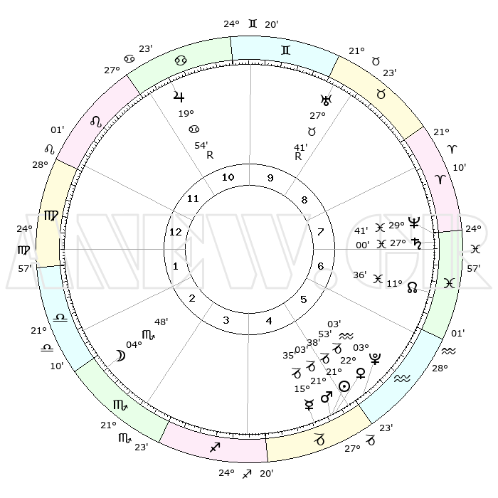 | | ΘΕΣΕΙΣ ΠΛΑΝΗΤΩΝ ΑΣΤΡΟΛΟΓΙΚΟΥ ΧΑΡΤΗ ΤΗΣ ΣΤΙΓΜΗΣ ΑΥΤΗΣ | | | | Πλανήτης | Ζώδιο | Μοίρες | Δεκαήμ. | Σε οίκο | Απόκλιση | | Ακμές των οίκων | | Ηλιος | Αιγόκερως | 21°26' | Τρίτο | 6 | 21 S 44 | | 1ος | 25°24' | Καρκίνος | | Σελήνη | Σκορπιός | 02°22' | Πρώτο | 4 | 16 S 05 | | 2ος | 16°10' | Λέων | | Ερμής | Αιγόκερως | 15°16' | Δεύτερο | 6 | 24 S 07 | | 3ος | 10°35' | Παρθένος | | Αφροδίτη | Αιγόκερως | 22°37' | Τρίτο | 6 | 22 S 24 | | 4ος | 11°01' | Ζυγός | | Αρης | Αιγόκερως | 20°54' | Τρίτο | 6 | 22 S 45 | | 5ος | 17°06' | Σκορπιός | | Δίας | Καρκίνος | 19°56'R | Δεύτερο | 12 | 22 N 13 | | 6ος | 23°35' | Τοξότης | | Κρόνος | Ιχθείς | 26°59' | Τρίτο | 9 | 03 S 14 | | 7ος | 25°24' | Αιγόκερως | | Ουρανός | Ταύρος | 27°42'R | Τρίτο | 11 | 19 N 27 | | 8ος | 16°10' | Υδροχόος | | Ποσειδώνας | Ιχθείς | 29°40' | Τρίτο | 9 | 01 S 21 | | 9ος | 10°35' | Ιχθείς | | Πλούτωνας | Υδροχόος | 03°03' | Πρώτο | 7 | 23 S 09 | | 10ος | 11°01' | Κριός | | Β. Δεσμός | Ιχθείς | 11°36' | Δεύτερο | 9 | 07 S 13 | | 11ος | 17°06' | Ταύρος | | Ωροσκόπος | Καρκίνος | 25°24' | Τρίτο | | | 12ος | 23°35' | Δίδυμοι | | Μεσουράνημα | Κριός | 11°01' | Δεύτερο | | | |