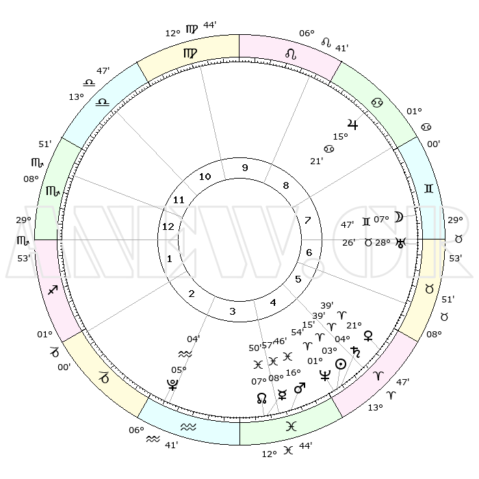 | | ΘΕΣΕΙΣ ΠΛΑΝΗΤΩΝ ΑΣΤΡΟΛΟΓΙΚΟΥ ΧΑΡΤΗ ΤΗΣ ΣΤΙΓΜΗΣ ΑΥΤΗΣ | | | | Πλανήτης | Ζώδιο | Μοίρες | Δεκαήμ. | Σε οίκο | Απόκλιση | | Ακμές των οίκων | | Ηλιος | Κριός | 03°11' | Πρώτο | 5 | 01 N 16 | | 1ος | 10°45' | Σκορπιός | | Σελήνη | Δίδυμοι | 06°50' | Πρώτο | 7 | 26 N 36 | | 2ος | 09°53' | Τοξότης | | Ερμής | Ιχθείς | 08°55' | Πρώτο | 4 | 07 S 58 | | 3ος | 12°52' | Αιγόκερως | | Αφροδίτη | Κριός | 21°34' | Τρίτο | 6 | 07 N 42 | | 4ος | 17°50' | Υδροχόος | | Αρης | Ιχθείς | 16°43' | Δεύτερο | 4 | 06 S 14 | | 5ος | 20°28' | Ιχθείς | | Δίας | Καρκίνος | 15°21' | Δεύτερο | 9 | 22 N 55 | | 6ος | 18°01' | Κριός | | Κρόνος | Κριός | 04°39' | Πρώτο | 5 | 00 S 06 | | 7ος | 10°45' | Ταύρος | | Ουρανός | Ταύρος | 28°26' | Τρίτο | 7 | 19 N 38 | | 8ος | 09°53' | Δίδυμοι | | Ποσειδώνας | Κριός | 01°54' | Πρώτο | 5 | 00 S 27 | | 9ος | 12°52' | Καρκίνος | | Πλούτωνας | Υδροχόος | 05°04' | Πρώτο | 3 | 22 S 48 | | 10ος | 17°50' | Λέων | | Β. Δεσμός | Ιχθείς | 07°50' | Πρώτο | 4 | 08 S 38 | | 11ος | 20°28' | Παρθένος | | Ωροσκόπος | Σκορπιός | 10°45' | Δεύτερο | | | 12ος | 18°01' | Ζυγός | | Μεσουράνημα | Λέων | 17°50' | Δεύτερο | | | |