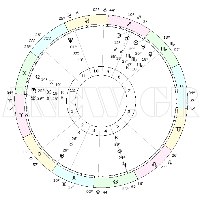 | | ΘΕΣΕΙΣ ΠΛΑΝΗΤΩΝ ΑΣΤΡΟΛΟΓΙΚΟΥ ΧΑΡΤΗ ΤΗΣ ΣΤΙΓΜΗΣ ΑΥΤΗΣ | | | | Πλανήτης | Ζώδιο | Μοίρες | Δεκαήμ. | Σε οίκο | Απόκλιση | | Ακμές των οίκων | | Ηλιος | Σκορπιός | 29°25' | Τρίτο | 9 | 20 S 01 | | 1ος | 12°30' | Ιχθείς | | Σελήνη | Τοξότης | 12°28' | Δεύτερο | 9 | 27 S 14 | | 2ος | 26°24' | Κριός | | Ερμής | Σκορπιός | 26°50'R | Τρίτο | 9 | 18 S 34 | | 3ος | 26°44' | Ταύρος | | Αφροδίτη | Σκορπιός | 18°15' | Δεύτερο | 8 | 16 S 16 | | 4ος | 20°04' | Δίδυμοι | | Αρης | Τοξότης | 12°17' | Δεύτερο | 9 | 22 S 50 | | 5ος | 11°50' | Καρκίνος | | Δίας | Καρκίνος | 24°59'R | Τρίτο | 5 | 21 N 16 | | 6ος | 06°49' | Λέων | | Κρόνος | Ιχθείς | 25°19'R | Τρίτο | 1 | 04 S 04 | | 7ος | 12°30' | Παρθένος | | Ουρανός | Ταύρος | 29°26'R | Τρίτο | 3 | 19 N 49 | | 8ος | 26°24' | Ζυγός | | Ποσειδώνας | Ιχθείς | 29°28'R | Τρίτο | 1 | 01 S 27 | | 9ος | 26°44' | Σκορπιός | | Πλούτωνας | Υδροχόος | 01°43' | Πρώτο | 11 | 23 S 27 | | 10ος | 20°04' | Τοξότης | | Β. Δεσμός | Ιχθείς | 14°19' | Δεύτερο | 1 | 06 S 10 | | 11ος | 11°50' | Αιγόκερως | | Ωροσκόπος | Ιχθείς | 12°30' | Δεύτερο | | | 12ος | 06°49' | Υδροχόος | | Μεσουράνημα | Τοξότης | 20°04' | Τρίτο | | | |