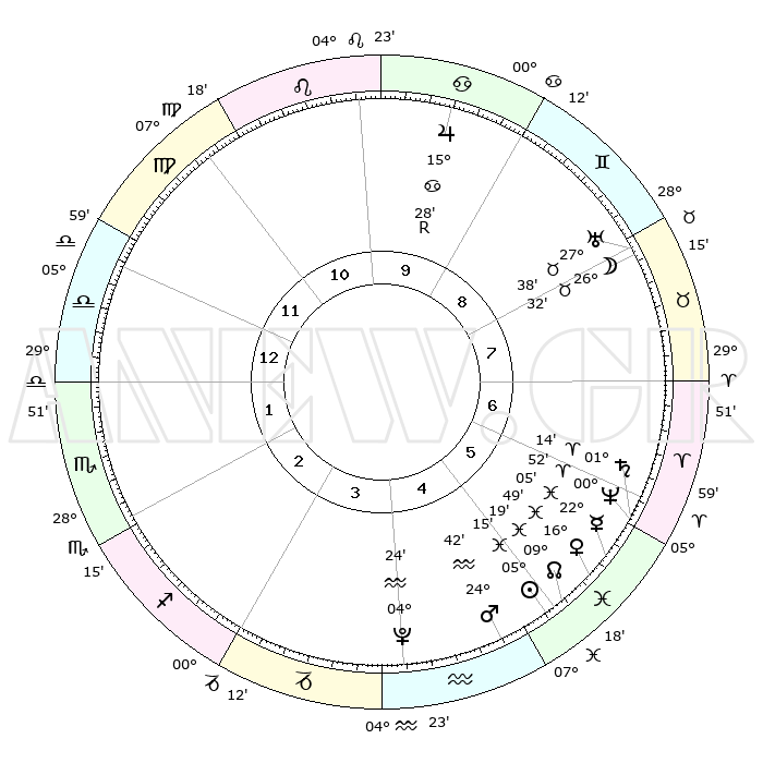 | | ΘΕΣΕΙΣ ΠΛΑΝΗΤΩΝ ΑΣΤΡΟΛΟΓΙΚΟΥ ΧΑΡΤΗ ΤΗΣ ΣΤΙΓΜΗΣ ΑΥΤΗΣ | | | | Πλανήτης | Ζώδιο | Μοίρες | Δεκαήμ. | Σε οίκο | Απόκλιση | | Ακμές των οίκων | | Ηλιος | Ιχθείς | 05°11' | Πρώτο | 5 | 09 S 36 | | 1ος | 12°59' | Ζυγός | | Σελήνη | Ταύρος | 25°43' | Τρίτο | 8 | 24 N 10 | | 2ος | 10°25' | Σκορπιός | | Ερμής | Ιχθείς | 22°04' | Τρίτο | 6 | 01 S 07 | | 3ος | 11°22' | Τοξότης | | Αφροδίτη | Ιχθείς | 16°44' | Δεύτερο | 5 | 06 S 33 | | 4ος | 14°39' | Αιγόκερως | | Αρης | Υδροχόος | 24°39' | Τρίτο | 5 | 14 S 20 | | 5ος | 17°35' | Υδροχόος | | Δίας | Καρκίνος | 15°28'R | Δεύτερο | 10 | 22 N 52 | | 6ος | 17°27' | Ιχθείς | | Κρόνος | Κριός | 01°14' | Πρώτο | 6 | 01 S 28 | | 7ος | 12°59' | Κριός | | Ουρανός | Ταύρος | 27°38' | Τρίτο | 8 | 19 N 27 | | 8ος | 10°25' | Ταύρος | | Ποσειδώνας | Κριός | 00°52' | Πρώτο | 6 | 00 S 51 | | 9ος | 11°22' | Δίδυμοι | | Πλούτωνας | Υδροχόος | 04°24' | Πρώτο | 4 | 22 S 54 | | 10ος | 14°39' | Καρκίνος | | Β. Δεσμός | Ιχθείς | 09°19' | Πρώτο | 5 | 08 S 04 | | 11ος | 17°35' | Λέων | | Ωροσκόπος | Ζυγός | 12°59' | Δεύτερο | | | 12ος | 17°27' | Παρθένος | | Μεσουράνημα | Καρκίνος | 14°39' | Δεύτερο | | | |