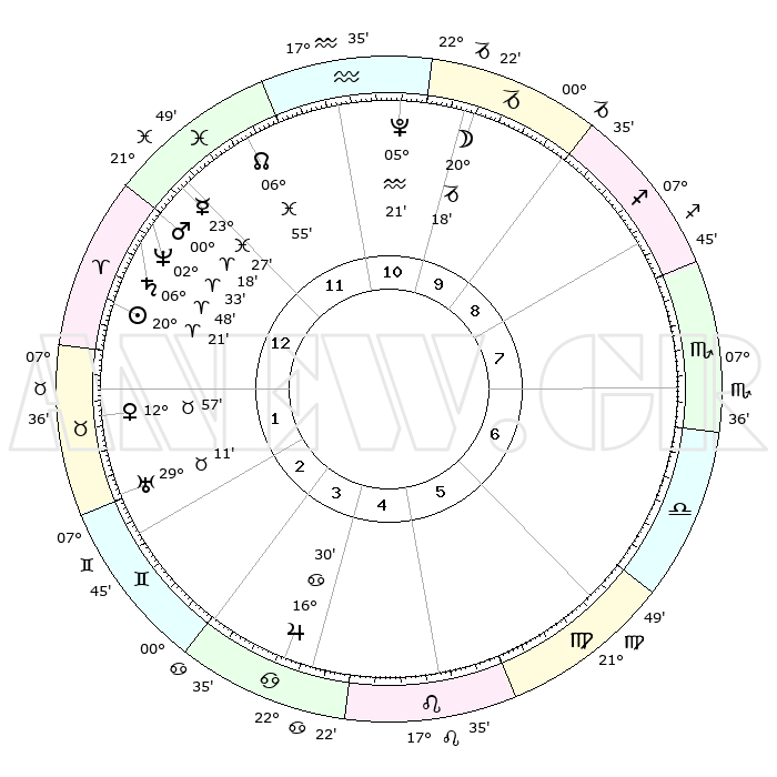 | | ΘΕΣΕΙΣ ΠΛΑΝΗΤΩΝ ΑΣΤΡΟΛΟΓΙΚΟΥ ΧΑΡΤΗ ΤΗΣ ΣΤΙΓΜΗΣ ΑΥΤΗΣ | | | | Πλανήτης | Ζώδιο | Μοίρες | Δεκαήμ. | Σε οίκο | Απόκλιση | | Ακμές των οίκων | | Ηλιος | Κριός | 20°16' | Τρίτο | 1 | 07 N 55 | | 1ος | 23°35' | Ιχθείς | | Σελήνη | Αιγόκερως | 19°22' | Δεύτερο | 11 | 25 S 53 | | 2ος | 05°21' | Ταύρος | | Ερμής | Ιχθείς | 23°21' | Τρίτο | 12 | 04 S 48 | | 3ος | 03°46' | Δίδυμοι | | Αφροδίτη | Ταύρος | 12°51' | Δεύτερο | 2 | 15 N 39 | | 4ος | 26°24' | Δίδυμοι | | Αρης | Κριός | 00°15' | Πρώτο | 1 | 00 S 50 | | 5ος | 18°27' | Καρκίνος | | Δίας | Καρκίνος | 16°30' | Δεύτερο | 4 | 22 N 47 | | 6ος | 14°54' | Λέων | | Κρόνος | Κριός | 06°47' | Πρώτο | 1 | 00 N 44 | | 7ος | 23°35' | Παρθένος | | Ουρανός | Ταύρος | 29°11' | Τρίτο | 2 | 19 N 48 | | 8ος | 05°21' | Σκορπιός | | Ποσειδώνας | Κριός | 02°33' | Πρώτο | 1 | 00 S 11 | | 9ος | 03°47' | Τοξότης | | Πλούτωνας | Υδροχόος | 05°21' | Πρώτο | 11 | 22 S 47 | | 10ος | 26°24' | Τοξότης | | Β. Δεσμός | Ιχθείς | 06°55' | Πρώτο | 12 | 08 S 58 | | 11ος | 18°27' | Αιγόκερως | | Ωροσκόπος | Ιχθείς | 23°35' | Τρίτο | | | 12ος | 14°54' | Υδροχόος | | Μεσουράνημα | Τοξότης | 26°24' | Τρίτο | | | |