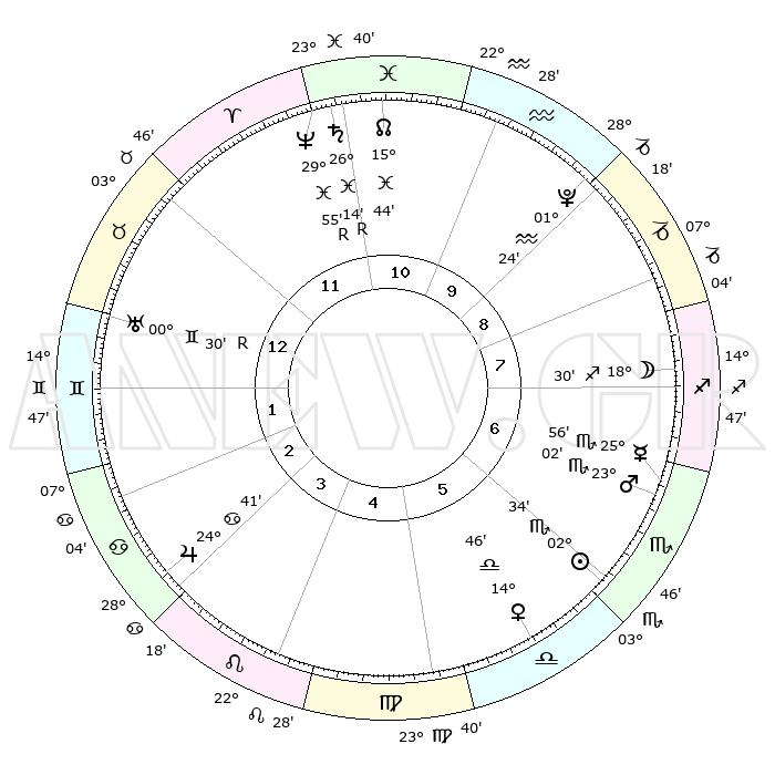 | | ΘΕΣΕΙΣ ΠΛΑΝΗΤΩΝ ΑΣΤΡΟΛΟΓΙΚΟΥ ΧΑΡΤΗ ΤΗΣ ΣΤΙΓΜΗΣ ΑΥΤΗΣ | | | | Πλανήτης | Ζώδιο | Μοίρες | Δεκαήμ. | Σε οίκο | Απόκλιση | | Ακμές των οίκων | | Ηλιος | Σκορπιός | 02°09' | Πρώτο | 11 | 12 S 13 | | 1ος | 05°15' | Τοξότης | | Σελήνη | Τοξότης | 13°26' | Δεύτερο | 1 | 27 S 29 | | 2ος | 07°09' | Αιγόκερως | | Ερμής | Σκορπιός | 25°26' | Τρίτο | 12 | 21 S 41 | | 3ος | 13°45' | Υδροχόος | | Αφροδίτη | Ζυγός | 14°14' | Δεύτερο | 10 | 04 S 12 | | 4ος | 19°50' | Ιχθείς | | Αρης | Σκορπιός | 22°44' | Τρίτο | 12 | 18 S 46 | | 5ος | 20°10' | Κριός | | Δίας | Καρκίνος | 24°40' | Τρίτο | 8 | 21 N 15 | | 6ος | 14°31' | Ταύρος | | Κρόνος | Ιχθείς | 26°16'R | Τρίτο | 4 | 03 S 46 | | 7ος | 05°15' | Δίδυμοι | | Ουρανός | Δίδυμοι | 00°31'R | Πρώτο | 6 | 20 N 03 | | 8ος | 07°09' | Καρκίνος | | Ποσειδώνας | Ιχθείς | 29°56'R | Τρίτο | 4 | 01 S 17 | | 9ος | 13°45' | Λέων | | Πλούτωνας | Υδροχόος | 01°24' | Πρώτο | 2 | 23 S 32 | | 10ος | 19°50' | Παρθένος | | Β. Δεσμός | Ιχθείς | 15°45' | Δεύτερο | 3 | 05 S 37 | | 11ος | 20°10' | Ζυγός | | Ωροσκόπος | Τοξότης | 05°15' | Πρώτο | | | 12ος | 14°31' | Σκορπιός | | Μεσουράνημα | Παρθένος | 19°50' | Δεύτερο | | | |