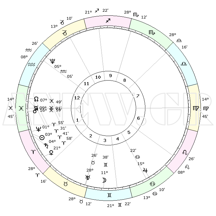 | | ΘΕΣΕΙΣ ΠΛΑΝΗΤΩΝ ΑΣΤΡΟΛΟΓΙΚΟΥ ΧΑΡΤΗ ΤΗΣ ΣΤΙΓΜΗΣ ΑΥΤΗΣ | | | | Πλανήτης | Ζώδιο | Μοίρες | Δεκαήμ. | Σε οίκο | Απόκλιση | | Ακμές των οίκων | | Ηλιος | Κριός | 03°27' | Πρώτο | 2 | 01 N 22 | | 1ος | 07°14' | Υδροχόος | | Σελήνη | Δίδυμοι | 10°36' | Δεύτερο | 4 | 27 N 12 | | 2ος | 22°20' | Ιχθείς | | Ερμής | Ιχθείς | 08°60' | Πρώτο | 1 | 08 S 00 | | 3ος | 29°33' | Κριός | | Αφροδίτη | Κριός | 21°53' | Τρίτο | 2 | 07 N 50 | | 4ος | 26°49' | Ταύρος | | Αρης | Ιχθείς | 16°55' | Δεύτερο | 1 | 06 S 09 | | 5ος | 19°07' | Δίδυμοι | | Δίας | Καρκίνος | 15°21' | Δεύτερο | 6 | 22 N 55 | | 6ος | 10°52' | Καρκίνος | | Κρόνος | Κριός | 04°40' | Πρώτο | 2 | 00 S 06 | | 7ος | 07°14' | Λέων | | Ουρανός | Ταύρος | 28°26' | Τρίτο | 4 | 19 N 38 | | 8ος | 22°20' | Παρθένος | | Ποσειδώνας | Κριός | 01°55' | Πρώτο | 2 | 00 S 26 | | 9ος | 29°33' | Ζυγός | | Πλούτωνας | Υδροχόος | 05°05' | Πρώτο | 12 | 22 S 48 | | 10ος | 26°49' | Σκορπιός | | Β. Δεσμός | Ιχθείς | 07°49' | Πρώτο | 1 | 08 S 38 | | 11ος | 19°07' | Τοξότης | | Ωροσκόπος | Υδροχόος | 07°14' | Πρώτο | | | 12ος | 10°52' | Αιγόκερως | | Μεσουράνημα | Σκορπιός | 26°49' | Τρίτο | | | |