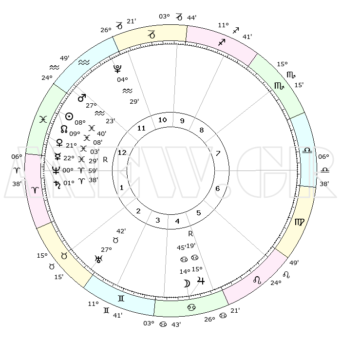 | | ΘΕΣΕΙΣ ΠΛΑΝΗΤΩΝ ΑΣΤΡΟΛΟΓΙΚΟΥ ΧΑΡΤΗ ΤΗΣ ΣΤΙΓΜΗΣ ΑΥΤΗΣ | | | | Πλανήτης | Ζώδιο | Μοίρες | Δεκαήμ. | Σε οίκο | Απόκλιση | | Ακμές των οίκων | | Ηλιος | Ιχθείς | 08°35' | Πρώτο | 1 | 08 S 21 | | 1ος | 26°11' | Υδροχόος | | Σελήνη | Καρκίνος | 13°45' | Δεύτερο | 5 | 27 N 03 | | 2ος | 11°51' | Κριός | | Ερμής | Ιχθείς | 22°30'R | Τρίτο | 1 | 00 S 14 | | 3ος | 15°20' | Ταύρος | | Αφροδίτη | Ιχθείς | 20°58' | Τρίτο | 1 | 04 S 51 | | 4ος | 10°07' | Δίδυμοι | | Αρης | Υδροχόος | 27°19' | Τρίτο | 1 | 13 S 26 | | 5ος | 01°50' | Καρκίνος | | Δίας | Καρκίνος | 15°19'R | Δεύτερο | 5 | 22 N 54 | | 6ος | 25°01' | Καρκίνος | | Κρόνος | Κριός | 01°37' | Πρώτο | 1 | 01 S 19 | | 7ος | 26°11' | Λέων | | Ουρανός | Ταύρος | 27°42' | Τρίτο | 3 | 19 N 28 | | 8ος | 11°51' | Ζυγός | | Ποσειδώνας | Κριός | 00°59' | Πρώτο | 1 | 00 S 48 | | 9ος | 15°20' | Σκορπιός | | Πλούτωνας | Υδροχόος | 04°29' | Πρώτο | 12 | 22 S 53 | | 10ος | 10°07' | Τοξότης | | Β. Δεσμός | Ιχθείς | 09°08' | Πρώτο | 1 | 08 S 08 | | 11ος | 01°50' | Αιγόκερως | | Ωροσκόπος | Υδροχόος | 26°11' | Τρίτο | | | 12ος | 25°01' | Αιγόκερως | | Μεσουράνημα | Τοξότης | 10°07' | Δεύτερο | | | |