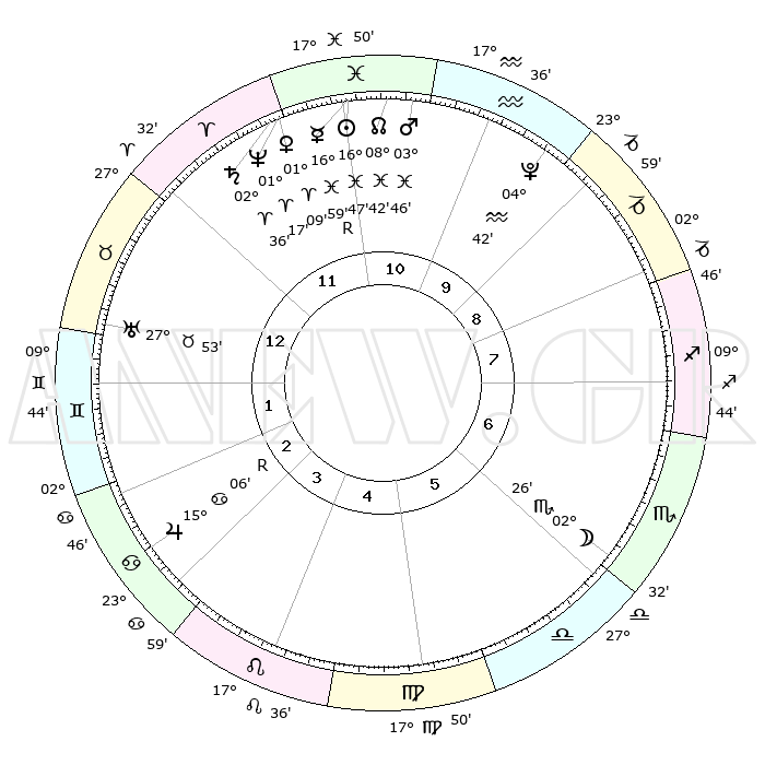 | | ΘΕΣΕΙΣ ΠΛΑΝΗΤΩΝ ΑΣΤΡΟΛΟΓΙΚΟΥ ΧΑΡΤΗ ΤΗΣ ΣΤΙΓΜΗΣ ΑΥΤΗΣ | | | | Πλανήτης | Ζώδιο | Μοίρες | Δεκαήμ. | Σε οίκο | Απόκλιση | | Ακμές των οίκων | | Ηλιος | Ιχθείς | 16°44' | Δεύτερο | 11 | 05 S 14 | | 1ος | 11°55' | Ταύρος | | Σελήνη | Σκορπιός | 01°39' | Πρώτο | 6 | 15 S 59 | | 2ος | 10°56' | Δίδυμοι | | Ερμής | Ιχθείς | 17°02'R | Δεύτερο | 11 | 01 S 45 | | 3ος | 03°25' | Καρκίνος | | Αφροδίτη | Κριός | 01°04' | Πρώτο | 12 | 00 S 43 | | 4ος | 25°17' | Καρκίνος | | Αρης | Ιχθείς | 03°43' | Πρώτο | 11 | 11 S 10 | | 5ος | 21°02' | Λέων | | Δίας | Καρκίνος | 15°07'R | Δεύτερο | 3 | 22 N 56 | | 6ος | 26°08' | Παρθένος | | Κρόνος | Κριός | 02°36' | Πρώτο | 12 | 00 S 55 | | 7ος | 11°55' | Σκορπιός | | Ουρανός | Ταύρος | 27°53' | Τρίτο | 1 | 19 N 31 | | 8ος | 10°56' | Τοξότης | | Ποσειδώνας | Κριός | 01°17' | Πρώτο | 12 | 00 S 41 | | 9ος | 03°25' | Αιγόκερως | | Πλούτωνας | Υδροχόος | 04°42' | Πρώτο | 10 | 22 S 51 | | 10ος | 25°17' | Αιγόκερως | | Β. Δεσμός | Ιχθείς | 08°43' | Πρώτο | 11 | 08 S 18 | | 11ος | 21°01' | Υδροχόος | | Ωροσκόπος | Ταύρος | 11°55' | Δεύτερο | | | 12ος | 26°08' | Ιχθείς | | Μεσουράνημα | Αιγόκερως | 25°17' | Τρίτο | | | |