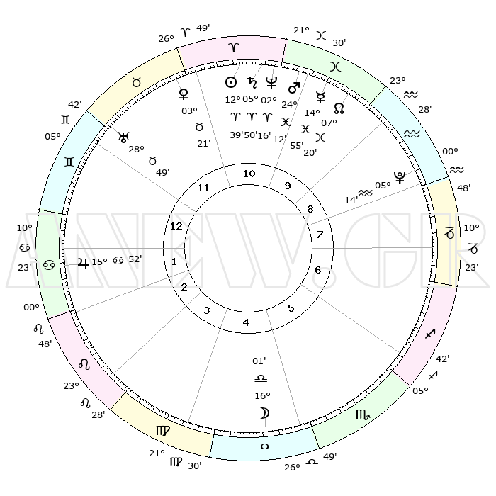 | | ΘΕΣΕΙΣ ΠΛΑΝΗΤΩΝ ΑΣΤΡΟΛΟΓΙΚΟΥ ΧΑΡΤΗ ΤΗΣ ΣΤΙΓΜΗΣ ΑΥΤΗΣ | | | | Πλανήτης | Ζώδιο | Μοίρες | Δεκαήμ. | Σε οίκο | Απόκλιση | | Ακμές των οίκων | | Ηλιος | Κριός | 12°35' | Δεύτερο | 11 | 04 N 58 | | 1ος | 19°38' | Δίδυμοι | | Σελήνη | Ζυγός | 15°14' | Δεύτερο | 5 | 08 S 51 | | 2ος | 11°19' | Καρκίνος | | Ερμής | Ιχθείς | 14°52' | Δεύτερο | 10 | 07 S 21 | | 3ος | 02°39' | Λέων | | Αφροδίτη | Ταύρος | 03°16' | Πρώτο | 11 | 12 N 14 | | 4ος | 27°26' | Λέων | | Αρης | Ιχθείς | 24°10' | Τρίτο | 10 | 03 S 16 | | 5ος | 29°33' | Παρθένος | | Δίας | Καρκίνος | 15°52' | Δεύτερο | 2 | 22 N 52 | | 6ος | 09°50' | Σκορπιός | | Κρόνος | Κριός | 05°50' | Πρώτο | 11 | 00 N 21 | | 7ος | 19°38' | Τοξότης | | Ουρανός | Ταύρος | 28°49' | Τρίτο | 12 | 19 N 43 | | 8ος | 11°19' | Αιγόκερως | | Ποσειδώνας | Κριός | 02°16' | Πρώτο | 11 | 00 S 18 | | 9ος | 02°39' | Υδροχόος | | Πλούτωνας | Υδροχόος | 05°14' | Πρώτο | 9 | 22 S 47 | | 10ος | 27°26' | Υδροχόος | | Β. Δεσμός | Ιχθείς | 07°20' | Πρώτο | 10 | 08 S 49 | | 11ος | 29°33' | Ιχθείς | | Ωροσκόπος | Δίδυμοι | 19°38' | Δεύτερο | | | 12ος | 09°50' | Ταύρος | | Μεσουράνημα | Υδροχόος | 27°26' | Τρίτο | | | |
