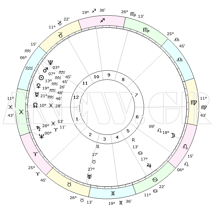 | | ΘΕΣΕΙΣ ΠΛΑΝΗΤΩΝ ΑΣΤΡΟΛΟΓΙΚΟΥ ΧΑΡΤΗ ΤΗΣ ΣΤΙΓΜΗΣ ΑΥΤΗΣ | | | | Πλανήτης | Ζώδιο | Μοίρες | Δεκαήμ. | Σε οίκο | Απόκλιση | | Ακμές των οίκων | | Ηλιος | Υδροχόος | 13°22' | Δεύτερο | 1 | 16 S 48 | | 1ος | 07°03' | Υδροχόος | | Σελήνη | Λέων | 17°12' | Δεύτερο | 7 | 17 N 32 | | 2ος | 22°08' | Ιχθείς | | Ερμής | Υδροχόος | 21°38' | Τρίτο | 1 | 16 S 00 | | 3ος | 29°22' | Κριός | | Αφροδίτη | Υδροχόος | 19°43' | Δεύτερο | 1 | 16 S 13 | | 4ος | 26°41' | Ταύρος | | Αρης | Υδροχόος | 07°41' | Πρώτο | 1 | 19 S 21 | | 5ος | 18°59' | Δίδυμοι | | Δίας | Καρκίνος | 17°13'R | Δεύτερο | 6 | 22 N 38 | | 6ος | 10°44' | Καρκίνος | | Κρόνος | Ιχθείς | 28°53' | Τρίτο | 2 | 02 S 26 | | 7ος | 07°03' | Λέων | | Ουρανός | Ταύρος | 27°28'R | Τρίτο | 4 | 19 N 24 | | 8ος | 22°08' | Παρθένος | | Ποσειδώνας | Κριός | 00°11' | Πρώτο | 2 | 01 S 08 | | 9ος | 29°22' | Ζυγός | | Πλούτωνας | Υδροχόος | 03°44' | Πρώτο | 12 | 23 S 01 | | 10ος | 26°41' | Σκορπιός | | Β. Δεσμός | Ιχθείς | 10°28' | Δεύτερο | 1 | 07 S 39 | | 11ος | 18°59' | Τοξότης | | Ωροσκόπος | Υδροχόος | 07°03' | Πρώτο | | | 12ος | 10°44' | Αιγόκερως | | Μεσουράνημα | Σκορπιός | 26°41' | Τρίτο | | | |