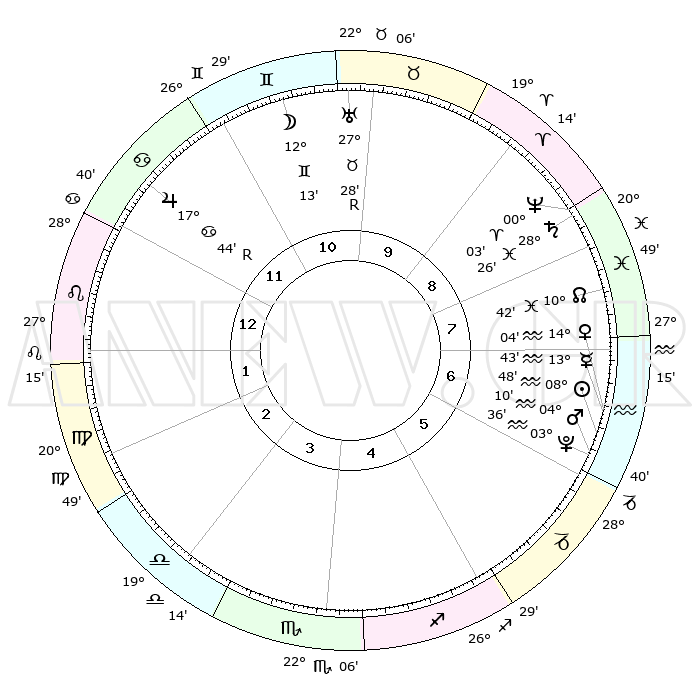 | | ΘΕΣΕΙΣ ΠΛΑΝΗΤΩΝ ΑΣΤΡΟΛΟΓΙΚΟΥ ΧΑΡΤΗ ΤΗΣ ΣΤΙΓΜΗΣ ΑΥΤΗΣ | | | | Πλανήτης | Ζώδιο | Μοίρες | Δεκαήμ. | Σε οίκο | Απόκλιση | | Ακμές των οίκων | | Ηλιος | Υδροχόος | 08°43' | Πρώτο | 7 | 18 S 04 | | 1ος | 07°20' | Λέων | | Σελήνη | Δίδυμοι | 11°13' | Δεύτερο | 11 | 27 N 16 | | 2ος | 28°56' | Λέων | | Ερμής | Υδροχόος | 13°36' | Δεύτερο | 7 | 18 S 41 | | 3ος | 24°58' | Παρθένος | | Αφροδίτη | Υδροχόος | 13°59' | Δεύτερο | 7 | 17 S 53 | | 4ος | 26°48' | Ζυγός | | Αρης | Υδροχόος | 04°07' | Πρώτο | 6 | 20 S 13 | | 5ος | 02°34' | Τοξότης | | Δίας | Καρκίνος | 17°44'R | Δεύτερο | 12 | 22 N 33 | | 6ος | 07°07' | Αιγόκερως | | Κρόνος | Ιχθείς | 28°26' | Τρίτο | 9 | 02 S 38 | | 7ος | 07°20' | Υδροχόος | | Ουρανός | Ταύρος | 27°29'R | Τρίτο | 10 | 19 N 24 | | 8ος | 28°56' | Υδροχόος | | Ποσειδώνας | Κριός | 00°03' | Πρώτο | 9 | 01 S 11 | | 9ος | 24°58' | Ιχθείς | | Πλούτωνας | Υδροχόος | 03°36' | Πρώτο | 6 | 23 S 03 | | 10ος | 26°48' | Κριός | | Β. Δεσμός | Ιχθείς | 10°42' | Δεύτερο | 8 | 07 S 33 | | 11ος | 02°34' | Δίδυμοι | | Ωροσκόπος | Λέων | 07°20' | Πρώτο | | | 12ος | 07°07' | Καρκίνος | | Μεσουράνημα | Κριός | 26°48' | Τρίτο | | | |