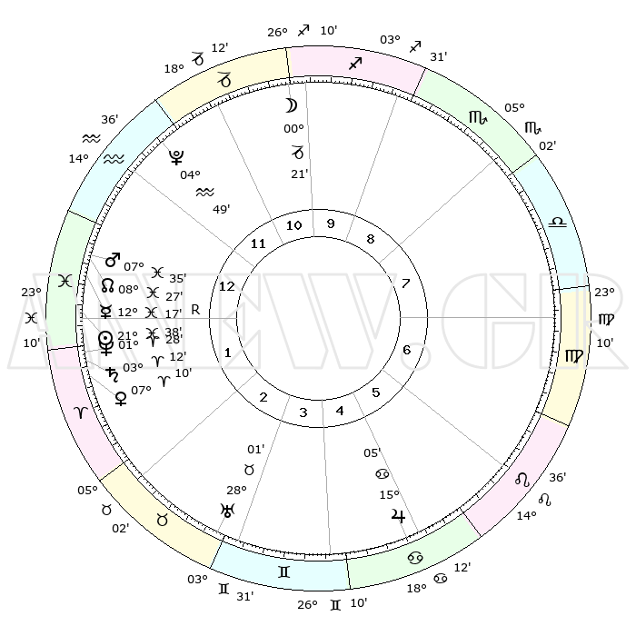 | | ΘΕΣΕΙΣ ΠΛΑΝΗΤΩΝ ΑΣΤΡΟΛΟΓΙΚΟΥ ΧΑΡΤΗ ΤΗΣ ΣΤΙΓΜΗΣ ΑΥΤΗΣ | | | | Πλανήτης | Ζώδιο | Μοίρες | Δεκαήμ. | Σε οίκο | Απόκλιση | | Ακμές των οίκων | | Ηλιος | Ιχθείς | 21°34' | Τρίτο | 1 | 03 S 21 | | 1ος | 20°30' | Υδροχόος | | Σελήνη | Τοξότης | 29°39' | Τρίτο | 11 | 28 S 22 | | 2ος | 06°19' | Κριός | | Ερμής | Ιχθείς | 12°20'R | Δεύτερο | 1 | 04 S 08 | | 3ος | 10°56' | Ταύρος | | Αφροδίτη | Κριός | 07°05' | Πρώτο | 2 | 01 N 47 | | 4ος | 06°22' | Δίδυμοι | | Αρης | Ιχθείς | 07°32' | Πρώτο | 1 | 09 S 45 | | 5ος | 28°11' | Δίδυμοι | | Δίας | Καρκίνος | 15°05' | Δεύτερο | 5 | 22 N 56 | | 6ος | 20°51' | Καρκίνος | | Κρόνος | Κριός | 03°11' | Πρώτο | 1 | 00 S 41 | | 7ος | 20°30' | Λέων | | Ουρανός | Ταύρος | 28°01' | Τρίτο | 3 | 19 N 33 | | 8ος | 06°19' | Ζυγός | | Ποσειδώνας | Κριός | 01°28' | Πρώτο | 1 | 00 S 37 | | 9ος | 10°56' | Σκορπιός | | Πλούτωνας | Υδροχόος | 04°49' | Πρώτο | 12 | 22 S 50 | | 10ος | 06°22' | Τοξότης | | Β. Δεσμός | Ιχθείς | 08°27' | Πρώτο | 1 | 08 S 24 | | 11ος | 28°11' | Τοξότης | | Ωροσκόπος | Υδροχόος | 20°30' | Τρίτο | | | 12ος | 20°51' | Αιγόκερως | | Μεσουράνημα | Τοξότης | 06°22' | Πρώτο | | | |